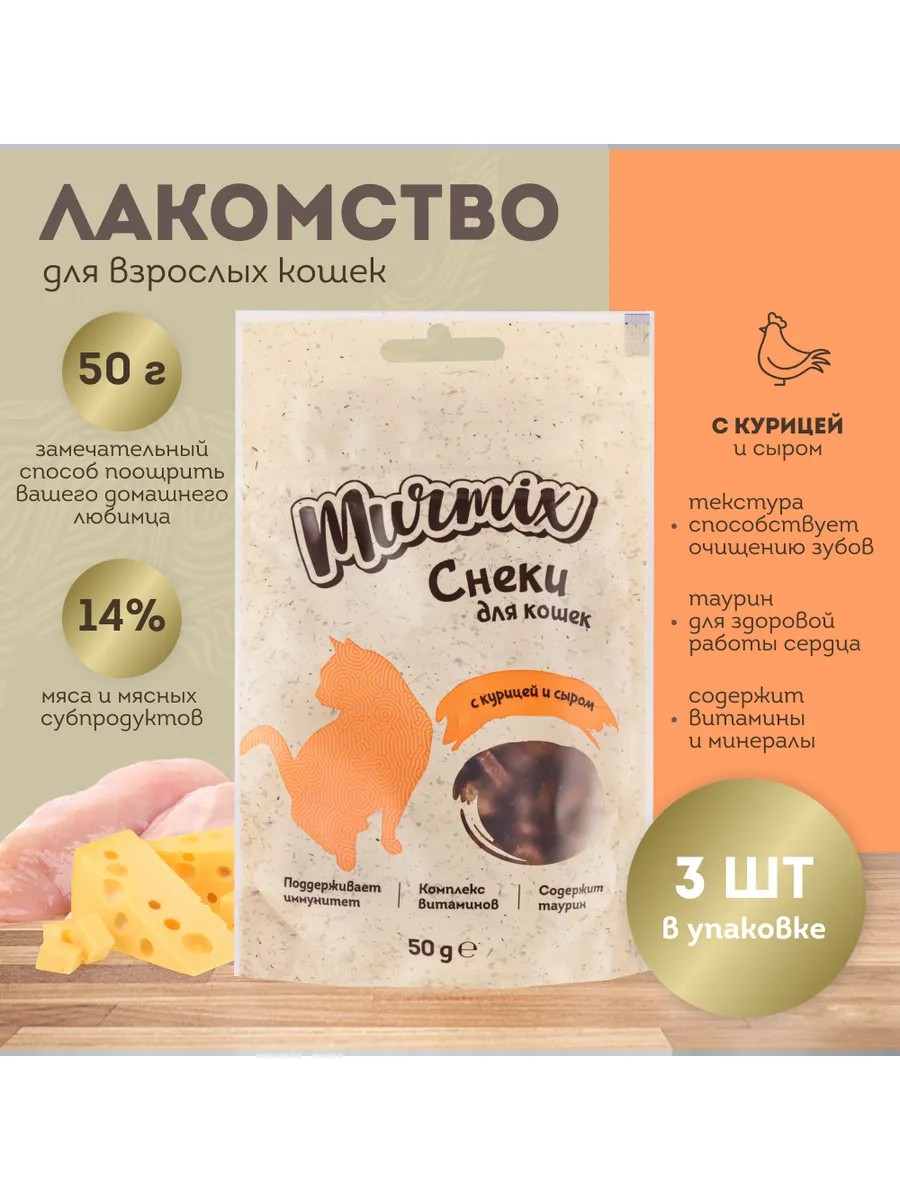 Снеки с курицей и сыром от Murmix являются не только сытным угощением для вашей кошки, но и благотворно влияют на ее иммунную систему. Комбинация мяса курицы, тающей во рту, с нежным сыром поразит даже наиболее капризного питомца. Лакомство используется как дополнение к основному приему пищи или в качестве поощрения.