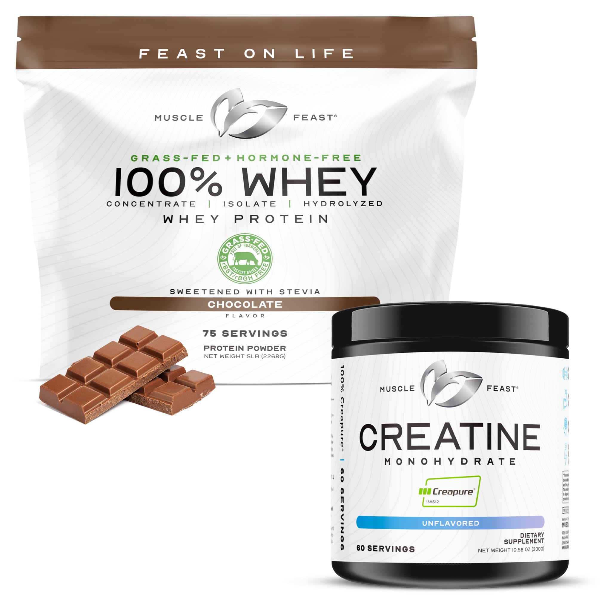 Muscle Feast 100% Whey + Creatine Bundle: (1) 100% Whey Protein (Chocolate 5lb) + (1) Creatine Powder (Unflavored 300g)