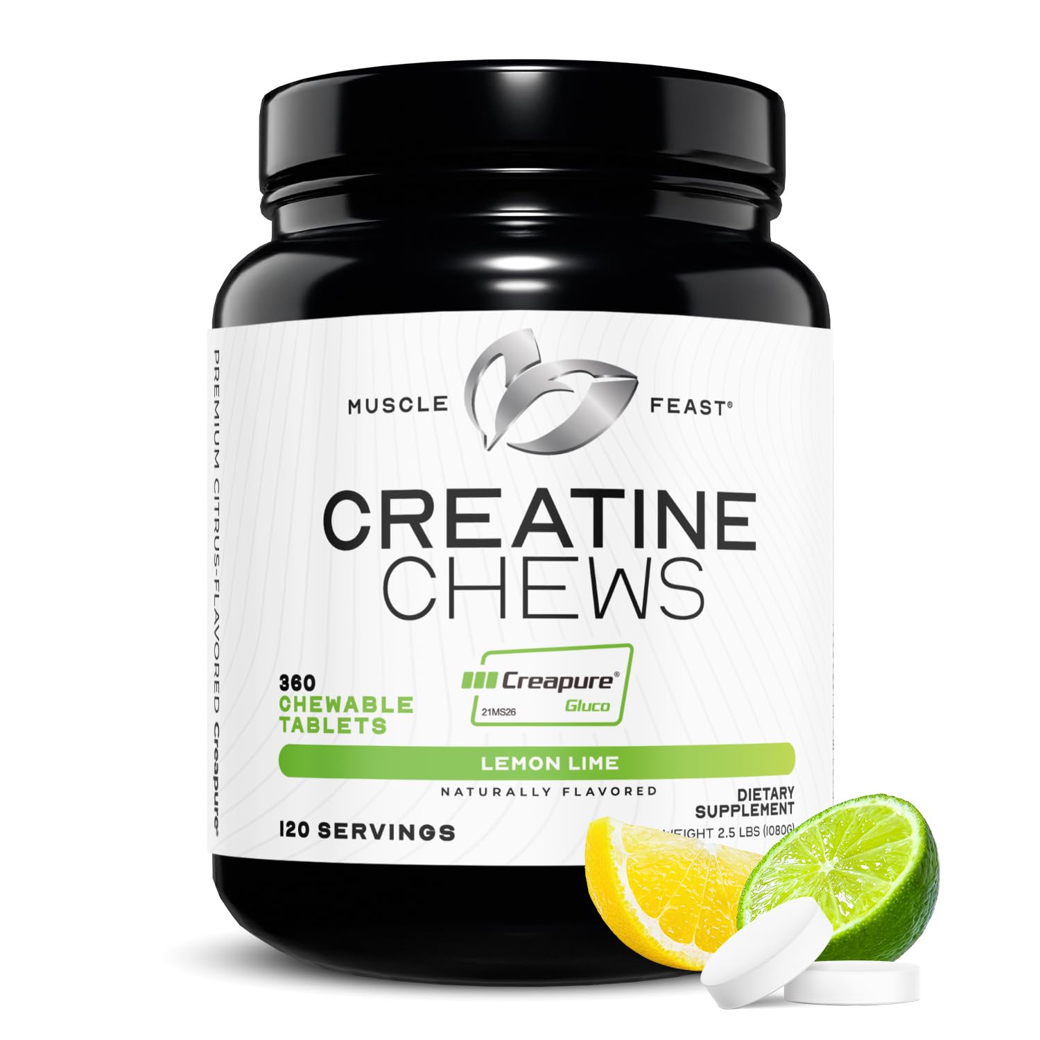 Muscle Feast Creatine Monohydrate Chewables - Vegan & Gluten-Free Creapure Creatine Chews for Men & Women - Delicious Citrus-Flavored Creatine Tablets for Muscle Building - Lemon Lime 360 Tabs Lemon Lime 1080 Gram