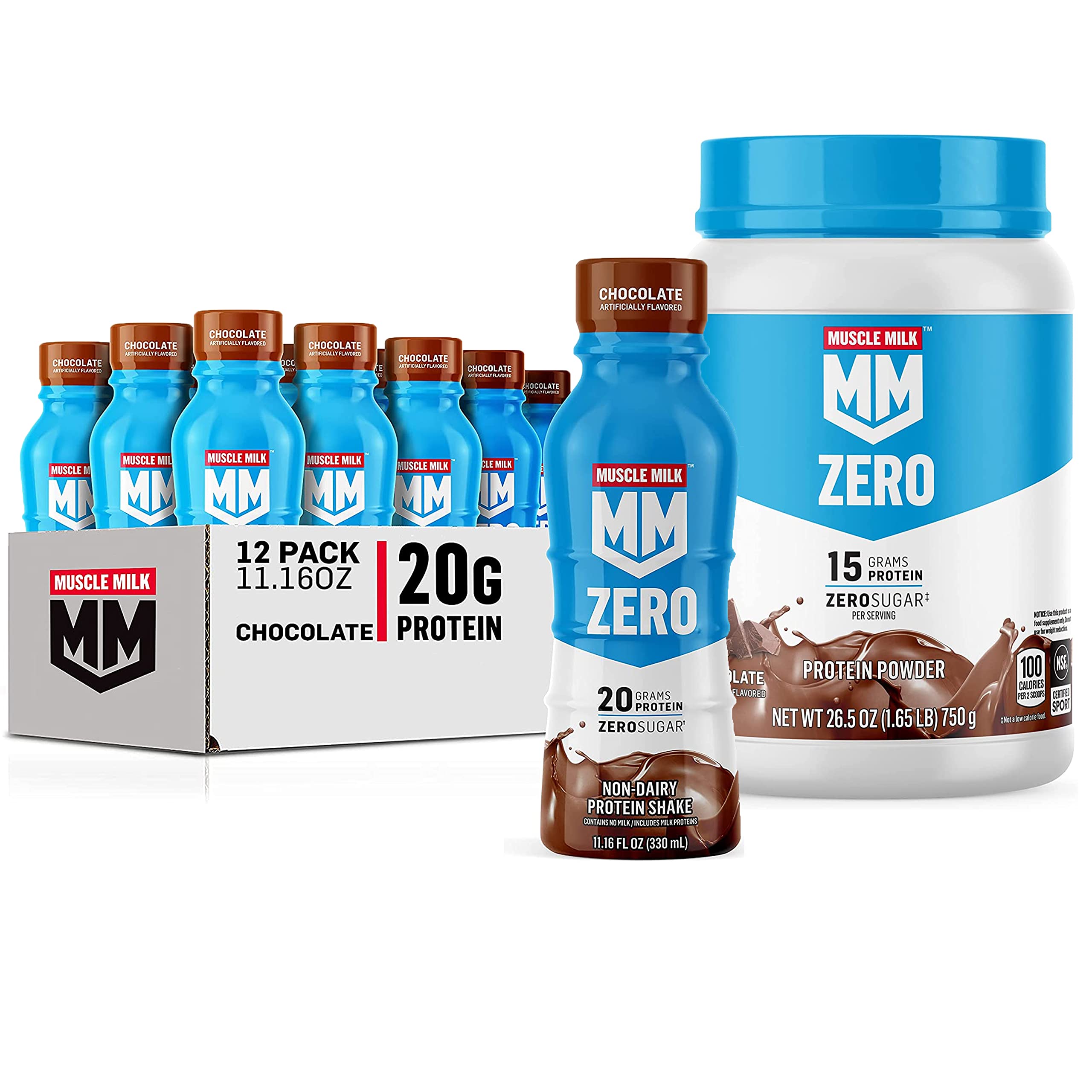 HELPS SATISFY HUNGER AND BUILD MUSCLE – Muscle Milk Zero Protein Powder supplies your body with high quality protein to support post-workout recovery and muscle growth. Also try taking it to-go in a shaker bottle for an energizing on-the-go breakfast or snack that helps satisfy hunger. SCIENCE BEHIND PROTEIN – Muscle Milk Zero provides a combination of slow releg and fast releg proteins to help increase amino acid levels. These essential amino acids play a role in muscle growth and maintenance of muscle mass. ZERO POWDER KEY FEATURES – Based on 1 serving, Muscle Milk Zero Protein Powder contains 15g high-quality protein, 100 calories, zero sugar, and an excellent source of Calcium and Vitamins A, C D. ZERO PROTEIN SHAKE KEY FEATURES – Based on 1 shake, Muscle Milk Zero Protein Shakes contain 20g protein, 100 calories, zero sugar, 4g fiber, and a good source of Calcium and Vitamins A, C D. VIRTUAL BUNDLE INCLUDES: 12 (11.16 Fl Oz) bottles of Muscle Milk Zero Protein Shake Shake, Chocolate flavor 1 (2.5lb) canister of Muscle Milk Zero 100 Calorie Protein Powder, Chocolate flavor.