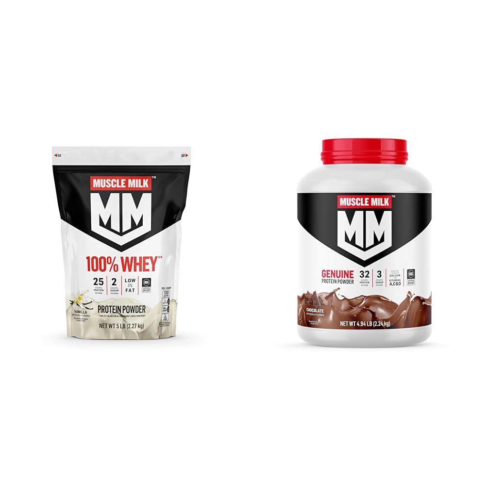 Muscle Milk 100 Whey Protein Powder, Vanilla, 5 Pound, 68 Servings, 25g Protein, 2g Sugar, Low in Fat, NSF Certified for Sport, Energizing Snack, Workout Recovery, Packaging May Vary Muscle Milk offers quality you can trust. Our 100 Whey protein powder supplies your body with high quality protein to support post-workout recovery and muscle growth, or can be consumed as an energizing breakfast or snack that helps satisfy hunger. It provides a blend of high-quality whey protein isolate and concentrate to help increase amino acid levels. These essential amino acids play a role in muscle growth and maintenance of muscle mass. The formula is also NSF Certified for Sport. Muscle Milk Genuine Protein Powder, Chocolate, 4.94 Pound, 32 Servings, 32g Protein, 2g Sugar, Calcium, Vitamins A, C D, NSF Certified for Sport, Energizing Snack, Packaging May Vary Muscle Milk offers quality you can trust. Our Genuine protein powder supplies your body with high quality protein to support post-workout recovery and muscle growth, or can be consumed as an energizing breakfast or snack that helps satisfy hunger. It provides a combination of high-quality slow releg and fast releg proteins to help increase amino acid levels. These essential amino acids play a role in muscle growth and maintenance of muscle mass. The formula is also NSF Certified for Sport.Product 2: VERSATILE AND EASY-TO-MIX – Muscle Milk Genuine Protein Powder dissolves easily in water just mix 2 scoops into 8 fluid ounces of water using a shaker bottle. Shaker bottle sold separately. Also add to recipes when you are looking for a protein boost. Product 2: KEY FEATURES – Based on 1 serving, Muscle Milk Genuine Protein Powder contains 32g high-quality protein, 2g sugar, and an excellent source of Calcium and Vitamins A, C D. Product 2: HELPS SATISFY HUNGER AND BUILD MUSCLE – Muscle Milk Genuine Protein Powder supplies your body with high quality protein to support post-workout recovery and muscle growth. Or try taking it to-go in a shaker bottle for an energizing on-the-go breakfast. Product 2: Contains one (1) 2.47 pound cannister (about 16 servings) of Muscle Milk Genuine Protein Powder. Packaging may vary. Shaker bottle sold separately. Product 1: VERSATILE AND EASY-TO-MIX – Muscle Milk 100 Whey Protein Powder dissolves easily in water just mix 1 scoop into 8 fluid ounces of water using a shaker bottle. Shaker bottle sold separately. Also add to recipes when you are looking for a protein boost. Product 1: KEY FEATURES – Based on 1 serving, Muscle Milk 100 Whey Protein Powder contains 25g high-quality 100 whey protein and 2g sugar. It's also low in fat. Product 1: HELPS SATISFY HUNGER AND BUILD MUSCLE – Muscle Milk 100 Whey Protein Powder supplies your body with high quality protein to support post-workout recovery and muscle growth. Try taking it to-go in a shaker bottle for an energizing on-the-go breakfast. Product 1: Contains one (1) 5 pound bag (about 68 servings) of Muscle Milk 100 Whey Protein Powder. Packaging may vary. Shaker bottle sold separately.