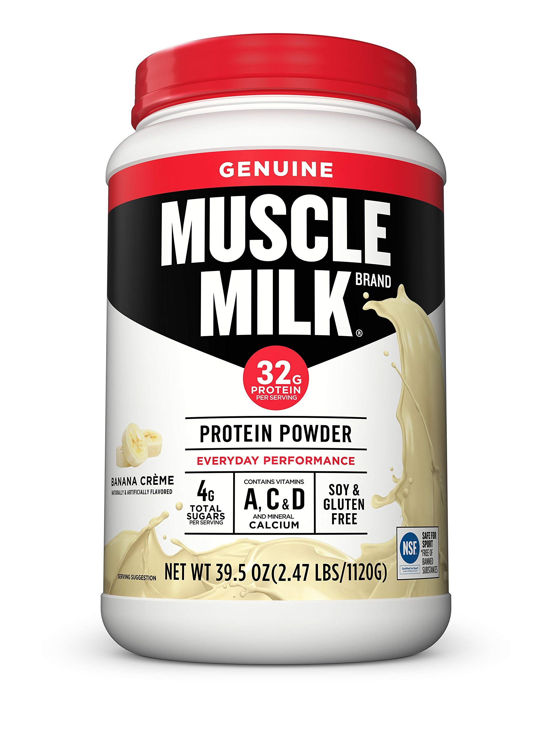 Muscle Milk Genuine Protein Powder, Banana Crème, 2.47 Pound, 16 Servings, 32g Protein, 2g Sugar, Calcium, Vitamins A, C D, NSF Certified for Sport, Energizing Snack, Workout Recovery, Packaging May Vary. TESTED FOR BANNED SUBSTANCES – Muscle Milk Protein Powders are NSF Certified for Sport. NSF screens for more than 270 substances banned by most major athletic organizations. SCIENCE BEHIND PROTEIN – Muscle Milk Genuine provides a combination of high-quality slow releg and fast releg proteins to help increase amino acid levels. These essential amino acids play a role in muscle growth and maintenance of muscle mass. VERSATILE AND EASY-TO-MIX – Muscle Milk Genuine Protein Powder dissolves easily in water just mix 2 scoops into 8 fluid ounces of water using a shaker bottle. Shaker bottle sold separately. Also add to recipes when you are looking for a protein boost. KEY FEATURES – Based on 1 serving, Muscle Milk Genuine Protein Powder contains 32g high-quality protein, 2g sugar, and an excellent source of Calcium and Vitamins A, C D. HELPS SATISFY HUNGER AND BUILD MUSCLE – Muscle Milk Genuine Protein Powder supplies your body with high quality protein to support post-workout recovery and muscle growth. Or try taking it to-go in a shaker bottle for an energizing on-the-go breakfast. Contains one (1) 2.47 pound cannister (about 16 servings) of Muscle Milk Genuine Protein Powder. Packaging may vary. Shaker bottle sold separately.