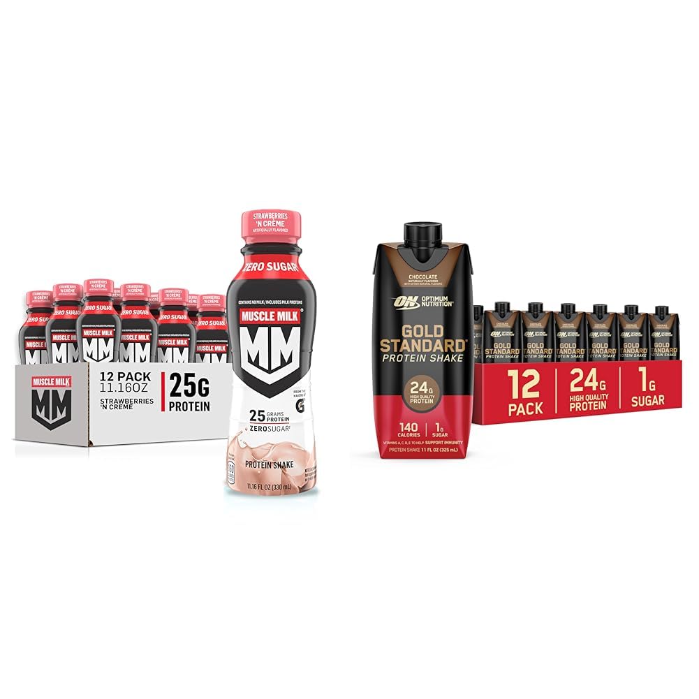 Satisfy your protein needs with this bundle containing 12 packs of Muscle Milk Genuine Strawberry protein shakes and 12 packs of Optimum Nutrition Gold Standard Chocolate protein shakes. The Muscle Milk shakes provide 25g protein per serving to help increase amino acid levels using a combination of fast and slow releg proteins. With 0g sugar and 5g fiber, these shakes can help satisfy hunger when consumed as an on-the-go breakfast or snack. The Optimum Nutrition shakes offer 24g premium protein per serving, with just 1g sugar and no added sugars. They also contain 24 vitamins and minerals, including Vitamins A, C, D and E for antioxidant and immune support. Both shakes use high-quality proteins and great flavors for a smooth, delicious drink that can be enjoyed on its own or added to foods and drinks when you want a protein boost. With Muscle Milk's 25g protein and Optimum Nutrition's 24g protein per serving, this bundle of ready-to-drink shakes provides a tasty way to help fill nutrient gaps, support energy metabolism, muscle building and recovery.