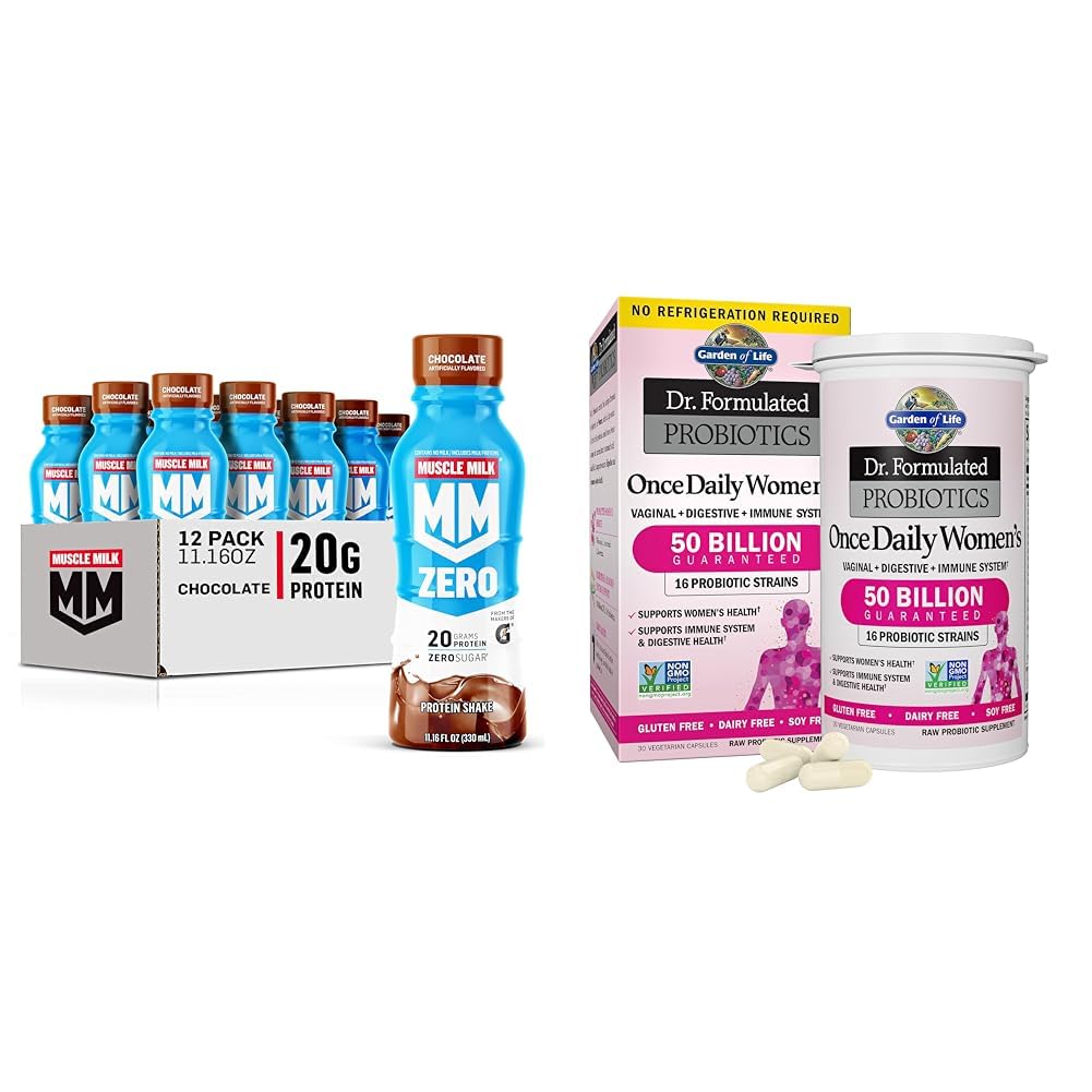 Muscle Milk Zero Protein Shake, Chocolate,20g Protein, Zero Sugar, 100 Calories, Calcium, Vitamins A, C D, 4g Fiber, Energizing Snack, Workout Recovery, Packaging May Vary,11.16 Fl Oz (Pack of 12) Muscle Milk Zero is an energizing protein shake that can be consumed as an on-the-go breakfast or anytime snack or to support post-workout recovery and muscle growth. It contains a combination of slow releg and fast releg proteins to help increase amino acid levels. These essential amino acids play a role in muscle growth. Also try adding your protein shake to coffee, smoothies or even oatmeal when you're looking for a protein boost. Garden of Life, Dr. Formulated Women's Probiotics Once Daily, 16 Strains, 50 Billion, 30 Count (Pack of 1) Women have unique needs and we've got a specialized formula just for you. Our Dr. Formulated Probiotics Once Daily Women's is proudly formulated by Dr. David Perlmutter, MD for optimal digestive, immune system, and vaginal health.† In just one daily capsule, we've included 50 Billion CFU of 16 diverse probiotic strains including L. reuteri and L. fermentum—clinically studied strains shown to support women's health.† There's also a whole food prebiotic fiber blend to promote the growth of good bacteria for optimal benefit.† Adults take 1 capsule daily. May be taken with or without food. Capsules can be opened and contents can be taken directly with water or juice. Not intended for children. †These statements have not been evaluated by the Food and Drug Administration. This product is not intended to diagnose, treat, cure or prevent any disease.Product 2: CONVENIENCE IN MIND: Keep your standards and strains high in a once-daily, easy-to-swallow vegetarian capsule If you prefer probiotic drinks, our capsules can also be opened contents mixed into water or your favorite beverages (not too hot or acidic). Product 2: BACKED BY SCIENCE: As a 4x Award Winning 1 Probiotic Brand, our probiotic is made with a great deal of research to ensure you are receiving the highest-quality and most diverse strains in a shelf-stable bottle to ensure they arrive alive and stay alive. Product 2: HIT REPHRESH: Girls just want to have pHun Our doctor formulated daily probiotic has clinically studied strains, L. reuteri and L. fermentum, to help maintain a healthy balance of good bacteria and pH levels for vaginal health and overall women's health. Product 2: THE GUT STUFF: Once Daily Women's is formulated for her unique needs with 50 Billion CFU of 16 diverse probiotics for optimal digestive and immune support We've also added our whole food prebiotic fiber blend to help promote the growth of good bacteria. Product 1: GREAT TASTING SHAKE – Muscle Milk Zero Ready to Drink Protein Shakes are smooth and delicious – just read our reviews. They taste great as is or added to coffee, oatmeal, pancakes, smoothies, and other foods when you're looking for a protein boost. Product 1: KEY FEATURES – Based on 1 shake, Muscle Milk Zero Protein Shakes contain 20g protein, 100 calories, zero sugar, 4g fiber, and a good source of Calcium and Vitamins A, C and D. Product 1: HELPS SATISFY HUNGER AND BUILD MUSCLE – Muscle Milk Zero is an energizing protein shake that can be consumed as an on-the-go breakfast or anytime snack or to support post-workout recovery and muscle growth or. Product 1: Contains twelve (12) 11.16 Fl Oz Bottles of Muscle Milk Zero Protein Shakes. Packaging may vary.