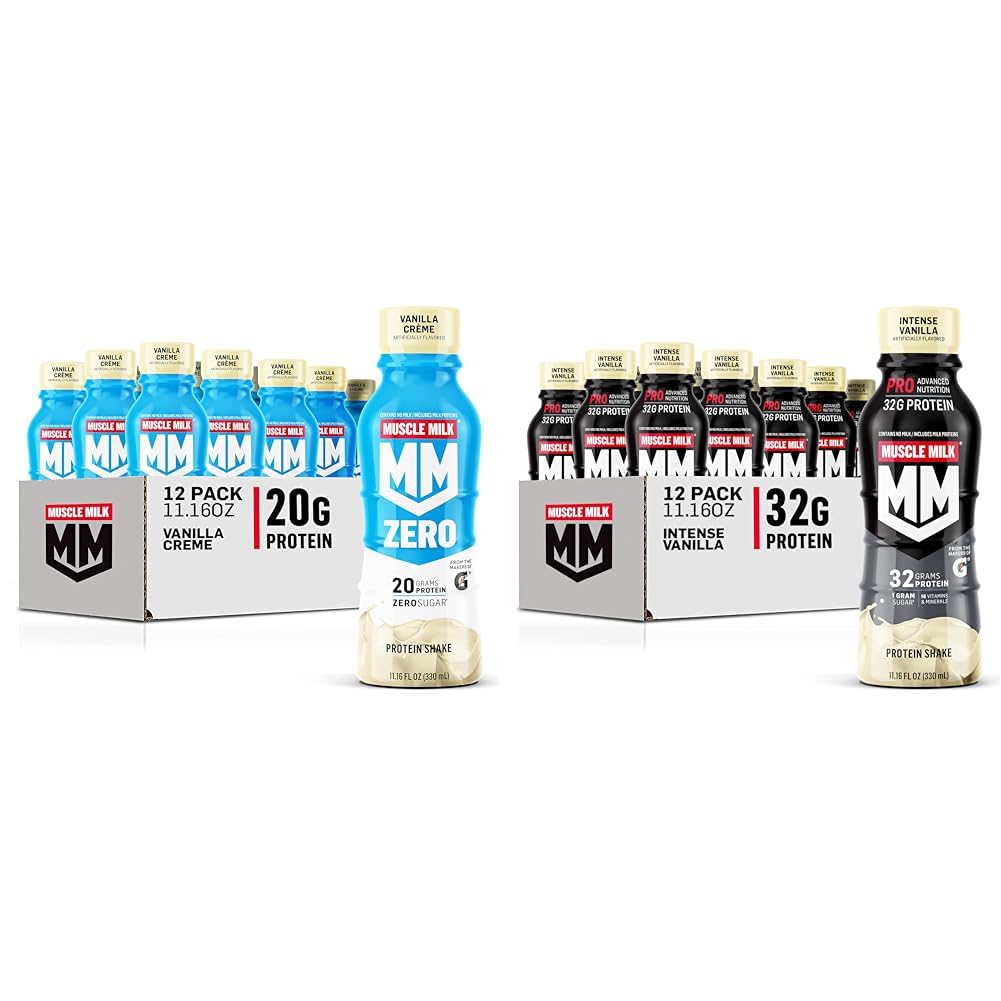Muscle Milk Zero Protein Shake, Vanilla Crème, 20g Protein, Zero Sugar, 100 Calories, Calcium, Vitamins A, C D, 4g Fiber, Energizing Snack, Workout Recovery, Packaging May Vary 11.16 Fl Oz (Pack of 12) Muscle Milk Zero is an energizing protein shake that can be consumed as an on-the-go breakfast or anytime snack or to support post-workout recovery and muscle growth. It contains a combination of slow releg and fast releg proteins to help increase amino acid levels. These essential amino acids play a role in muscle growth. Also try adding your protein shake to coffee, smoothies or even oatmeal when you're looking for a protein boost. Muscle Milk Pro Advanced Nutrition Protein Shake, Intense Vanilla, 11.16 Fl Oz (Pack of 12), 32g Protein, 1g Sugar, 16 Vitamins Minerals, 5g Fiber, Workout Recovery, Energizing Snack, Packaging May Vary Muscle Milk Pro Advanced Nutrition is an energizing protein shake that can be consumed to support post-workout recovery and muscle growth or as an on-the-go breakfast or anytime snack. It contains a combination of slow releg and fast releg proteins to help increase amino acid levels. These essential amino acids play a role in muscle growth. Also try adding your protein shake to coffee, smoothies or even oatmeal when you're looking for a protein boost.Product 2: GREAT TASTING SHAKE – Muscle Milk Pro Advanced Nutrition Ready to Drink Protein Shakes are smooth and delicious – just read our reviews. They taste great as is or added to coffee, oatmeal, pancakes, smoothies, and other foods when you're looking for a protein boost. Product 2: KEY FEATURES – Based on 1 shake, Muscle Milk Pro Advanced Nutrition Protein Shakes contain 32g protein, 1g sugar, 16 vitamins and minerals and a good source of fiber. Product 2: HELPS SATISFY HUNGER AND BUILD MUSCLE – The Muscle Milk Pro Advanced Nutrition Protein Shake is an energizing protein shake that can be consumed to support post-workout recovery and muscle growth and maintenance or to satisfy hunger when you're on-the-go in between meals. Product 2: Contains twelve (12) 11.16 Fl Oz Bottles of Muscle Milk Pro Advanced Nutrition Protein Shakes. Packaging may vary. Product 1: GREAT TASTING SHAKE – Muscle Milk Zero Ready to Drink Protein Shakes are smooth and delicious – just read our reviews. They taste great as is or added to coffee, oatmeal, pancakes, smoothies, and other foods when you're looking for a protein boost. Product 1: KEY FEATURES – Based on 1 shake, Muscle Milk Zero Protein Shakes contain 20g protein, 100 calories, zero sugar, 4g fiber, and a good source of Calcium and Vitamins A, C D. Product 1: HELPS SATISFY HUNGER AND BUILD MUSCLE – Muscle Milk Zero is an energizing protein shake that can be consumed as an on-the-go breakfast or anytime snack or to support post-workout recovery and muscle growth or. Product 1: Contains twelve (12) 11.16 Fl Oz Bottles of Muscle Milk Zero Protein Shakes. Packaging may vary.