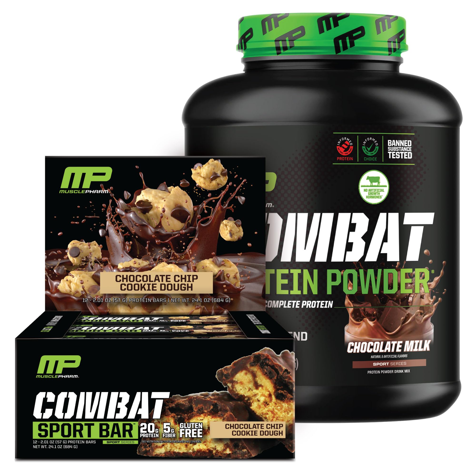 MusclePharm Combat Protein Powder is the ultimate choice for athletes who push their limits and expect nothing but the best from their high protein shakes. Each serving of Combat Protein Powder delivers a commanding 25 grams of protein, fueling your muscles to ensure your hard work and dedication yield real results. Combat Protein is the athlete's complete protein. MusclePharm Combat Sport Bar are the Protein Bars for athletes and fitness enthusiasts looking for a delicious and nutritious way to fuel their bodies. Each soft-baked bar delivers 20 grams of premium protein, sourced from whey isolate and concentrate to support muscle recovery and growth. The Chip Cookie Dough flavor not only tastes great and helps boost high protein but also satisfies cravings in a healthy way.