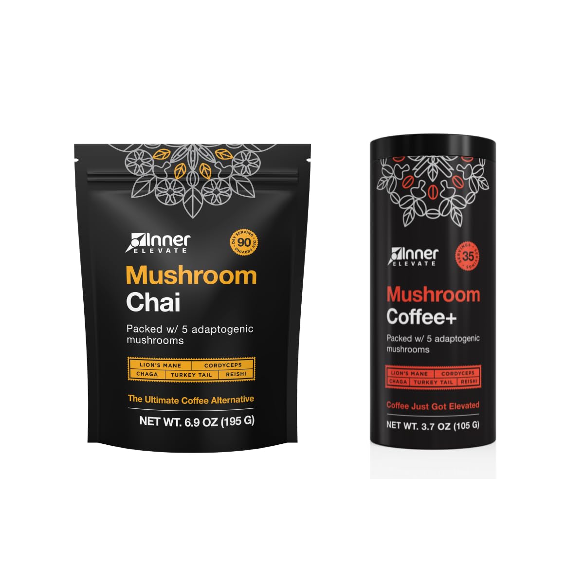 USA MADE - Made in the USA with all natural, premium ingredients. Our mushrooms come from 100 whole fruiting bodies with zero fillers. ANCIENT SUPERFOODS - These 5 medicinal mushrooms (Lion's Mane, Cordyceps, Chaga, Reishi, Turkey Tail) have been revered for thousands of years as powerful superfoods. Nurture your mind and body with Inner Elevate's mushroom beverages. ? COFFEE JUST GOT ELEVATED - 100 Arabica Colombian coffee combined with 5 powerful mushroom extracts to deliver a healthier, upgraded coffee without the jitters or crash. ? MUSHROOM CHAI - Indian masala chai combined with 5 adaptogenic mushrooms that provide a natural, clean source of energy without loads of caffeine. VALUE - Save money and get both Inner Elevate's Mushroom Chai (90 Servings) and Mushroom Coffee with this value bundle!.