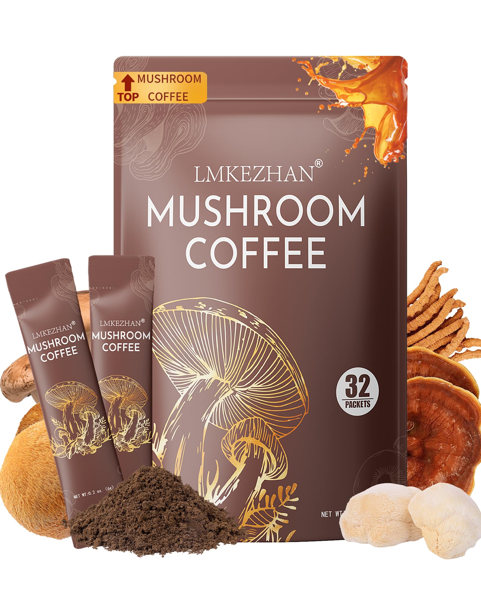 Taste Elevated: Made with premium Arabica coffee and six functional mushrooms, our mushroom coffee has a smooth, rich flavor with a subtle twist. The natural ingredients may create a slight difference from regular coffee, but we've crafted it to ensure an enjoyable experience. If you're not satisfied, we'll gladly make it right—24 7 support always here. Reimagined Coffee: Start your day with a healthier coffee choice that energizes without excess caffeine or calories. Perfect for mornings, pre-workout boosts, or post-exercise recovery, this instant coffee delivers sustained energy and focus with adaptogenic mushrooms, offering a smarter, wellness-focused alternative to traditional coffee. Handy single-serve packs: Our mushroom coffee comes in 32 individual stick sachets, designed for ultimate portability and convenience. The compact packaging fits easily into your bag, making it perfect for work or travel. Its powder form dissolves instantly in hot or cold water, allowing for quick and effortless preparation. Mushroom Coffee Magic: Perfect for busy workdays or relaxing weekends, our organic mushroom coffee blends six powerful mushrooms—Lion's Mane for focus, Cordyceps for energy, Reishi for restful sleep, Shiitake for immunity, Turkey Tail for gut wellness, and King Trumpet for longevity—offering a balanced mix of wellness benefits to refresh your body and mind. 6 Organic Mushrooms Blend: Each serving delivers a generous amount extracts of 6 organic mushrooms—Cordyceps, Lion's Mane, Reishi, Shiitake, Turkey Tail, and King Trumpet—combined with MCT oil and Organic Arabica Coffee, creating the perfect instant mushroom coffee for clean energy, enhanced focus, and rich, natural flavor.