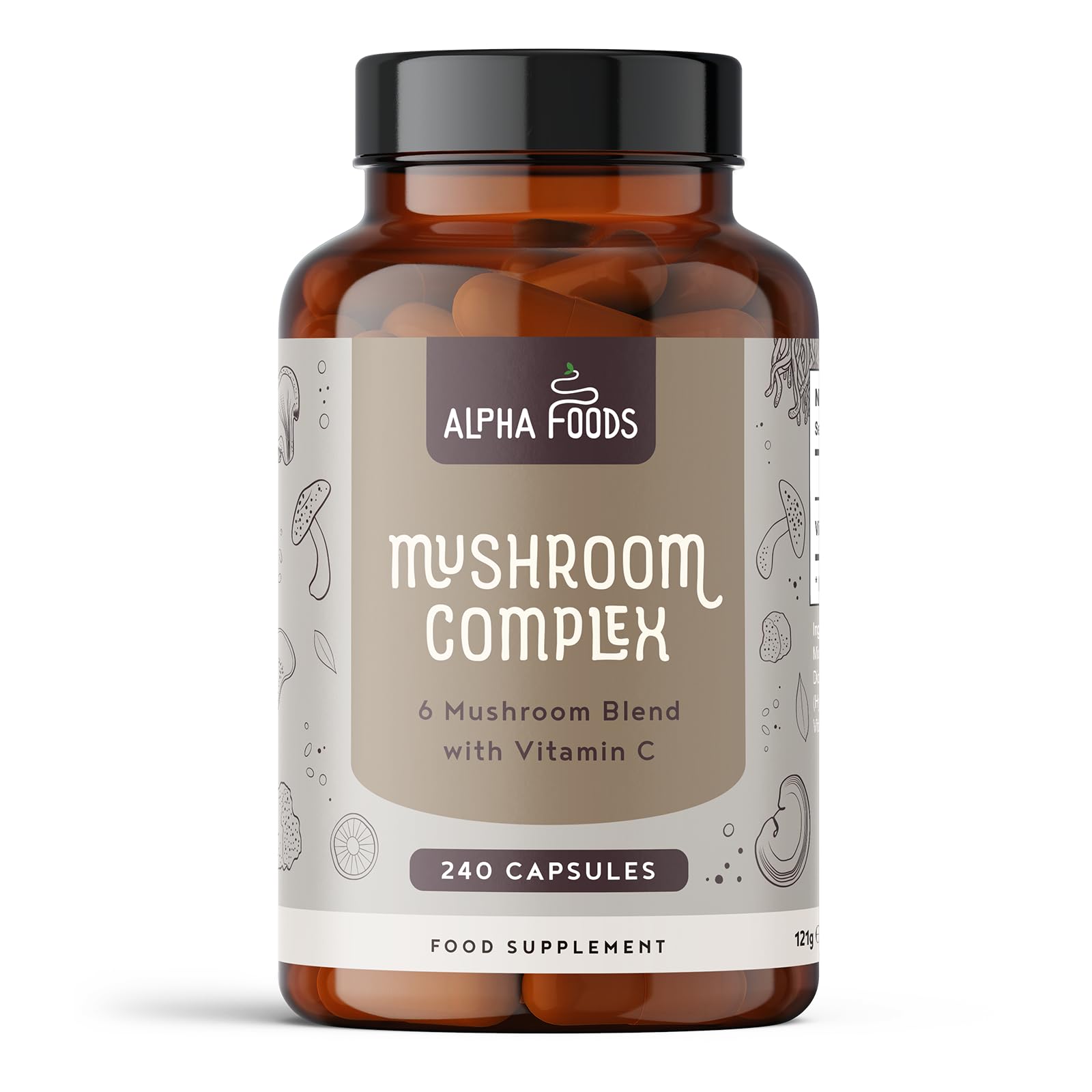 CRAFTED WITH CARE: At Alpha Foods, we believe in the integrity of our raw materials, which serve as the cornerstone of every product we offer. Our mission is to create powerful plant-based foods and nutritional supplements using the finest ingredients, dedicated to supporting your overall well-being. TRUSTED: Safety is our top priority, which is why Alpha Foods undergoes the most extensive testing procedures. We do not mass-produce our products and we blend all our powders in small batches in a state-of-the-art production facility, according to the strictest quality standards. All products are sourced from certified raw materials, in accordance with current European regulations. HOW TO TAKE: Our high-quality mushroom complex supplement is both vegan and vegetarian, and suitable for both men and women. With a recommended daily dose of 2 capsules, our 240-count bottle will last you 4 months. It's easy to incorporate into your daily routine to support a healthy lifestyle alongside a balanced diet. MUSHROOM SUPPLEMENT WITH VIT C BENEFITS.: Mushrooms have been traditionally used in Chinese medicine for hundreds of years, and our 6-blend complex has been formulated with Vitamin C and Zinc which contribute to: psychological function, normal functioning of the nervous system, normal functioning of the immune system and normal cognitive function (claims as supported by EFSA). WHY ALPHA FOODS MUSHROOM COMPLEX CAPSULES? Each serving of our 2 vegan mushroom capsules contains a specially formulated blend of 6 mushrooms: Lions Mane 12.5mg, Cordyceps 37.5mg, Shiitake 37.5mg, Reishi 30mg, Chaga 15mg and Maitake 37.5mg as well as 2.5mg of Zinc and 40mg of Vitamin C for additional benefits and 5mg of Black Pepper for better absorption.FABRIQUÉS AVEC SOIN: Chez Alpha Foods, nous croyons en l'intégrité de nos matières premières, qui servent de pierre angulaire à chaque produit que nous proposons. Notre mission est de créer des aliments puissants à base de plantes et des suppléments nutritionnels en utilisant les meilleurs ingrédients, dédiés à soutenir votre bien-être global. FIABLE: La sécurité est notre priorité absolue, c'est pourquoi Alpha Foods est soumis aux procédures de contrôle les plus étendues. Nous ne produisons pas nos produits en masse et nous mélangeons toutes nos poudres par petits lots dans une installation de production ultramoderne, selon les normes de qualité les plus strictes. Tous les produits proviennent de matières premières certifiées, conformément aux réglementations européennes en vigueur. COMMENT PRENDRE : Notre supplément de complexe de champignons de haute qualité est à la fois végétalien et végétarien, et convient aussi bien aux hommes qu'aux femmes. Avec une dose quotidienne recommandée de 2 gélules, notre bouteille de 240 unités vous durera 4 mois. Il est facile à incorporer dans votre routine quotidienne pour soutenir un mode de vie sain en parallèle d'un régime alimentaire équilibré. SUPPLÉMENT DE CHAMPIGNONS AVEC VIT C AVANTAGES. : Les champignons sont traditionnellement utilisés dans la médecine chinoise depuis des centaines d'années, et notre complexe de 6 mélanges a été formulé avec de la vitamine C et du zinc qui contribuent à : la fonction psychologique, le fonctionnement normal du système nerveux, le fonctionnement normal du système immunitaire et la fonction cognitive normale (allégations telles que corroborées par l'EFSA). POURQUOI LES CAPSULES ALPHA FOODS MUSHROOM COMPLEX ? Chaque portion de nos 2 gélules de champignons végétaliens contient un mélange spécialement formulé de 6 champignons : Lions Mane 12,5mg, Cordyceps 37,5mg, Shiitake 37,5mg, Reishi 30mg, Chaga 15mg et Maitake 37,5mg ainsi que 2,5mg de Zinc et 40mg de Vitamine C pour des bénéfices supplémentaires et 5mg de poivre noir pour une meilleure absorption.