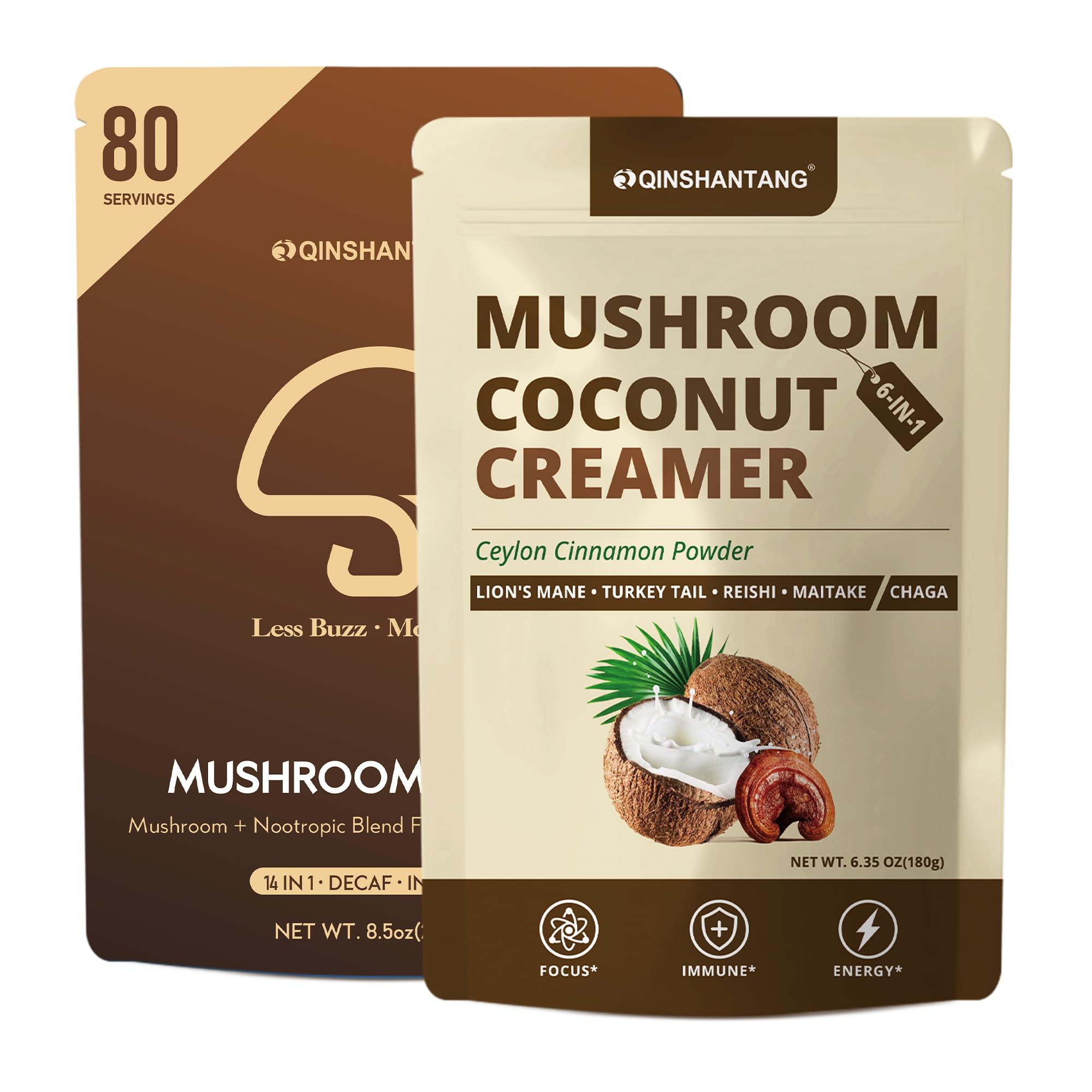 BRADN PROMISE: QIN SHAN TANG quality: Sustainably sourced mushrooms, rigorously tested for purity. Every batch crafted to deliver optimal potency and effectiveness for your daily wellness ritual. 80 SERVINGS PER BAG: Each 8.5oz bag delivers 80 servings of premium instant coffee—ready in seconds. We prioritize purity with rigorously tested ingredients and a commitment to transparency. No fillers or additives—just a simple, reliable cup that fits seamlessly into your daily routine. SMOOTH TASTE: Engineered for coffee lovers who value both flavor and comfort. This instant blend dissolves seamlessly in warm water, offering a velvety texture. Whether you're rushing through mornings or winding down at night, it's the perfect guilt-free indulgence. DECAFFEINATED: Crafted with simple, natural ingredients, our delicious decaf coffee offers rich flavor without the jitters or crashes. Just stir a spoonful into hot or cold water for an instant drink that satisfies coffee cravings while supporting holistic wellness. 14 NATURAL MUSHROOMS:14 powerful mushrooms—Lion's Mane, Turkey Tail, Chaga, Phellinus Linteus, Reishi, Tremella, Cordyceps, Black Fungus, Maitake, Agaricus Blazei, Poria, Oyster Mushroom, Shiitake, and King Oyster. This Mushroom blend supports immune health, sharpens mental focus, and delivers clean energy for your active lifestyle.
