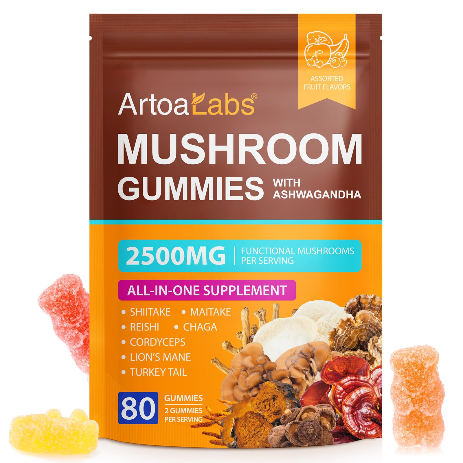 Mushroom Gummies with Ashwagandha 2500mg Lions Mane Mushroom Supplement Blend Organic Reishi Cordyceps Turkey Tail & More Boosts Energy Memory Immune Defense- 80 Gummies 80 Count (Pack of 1)