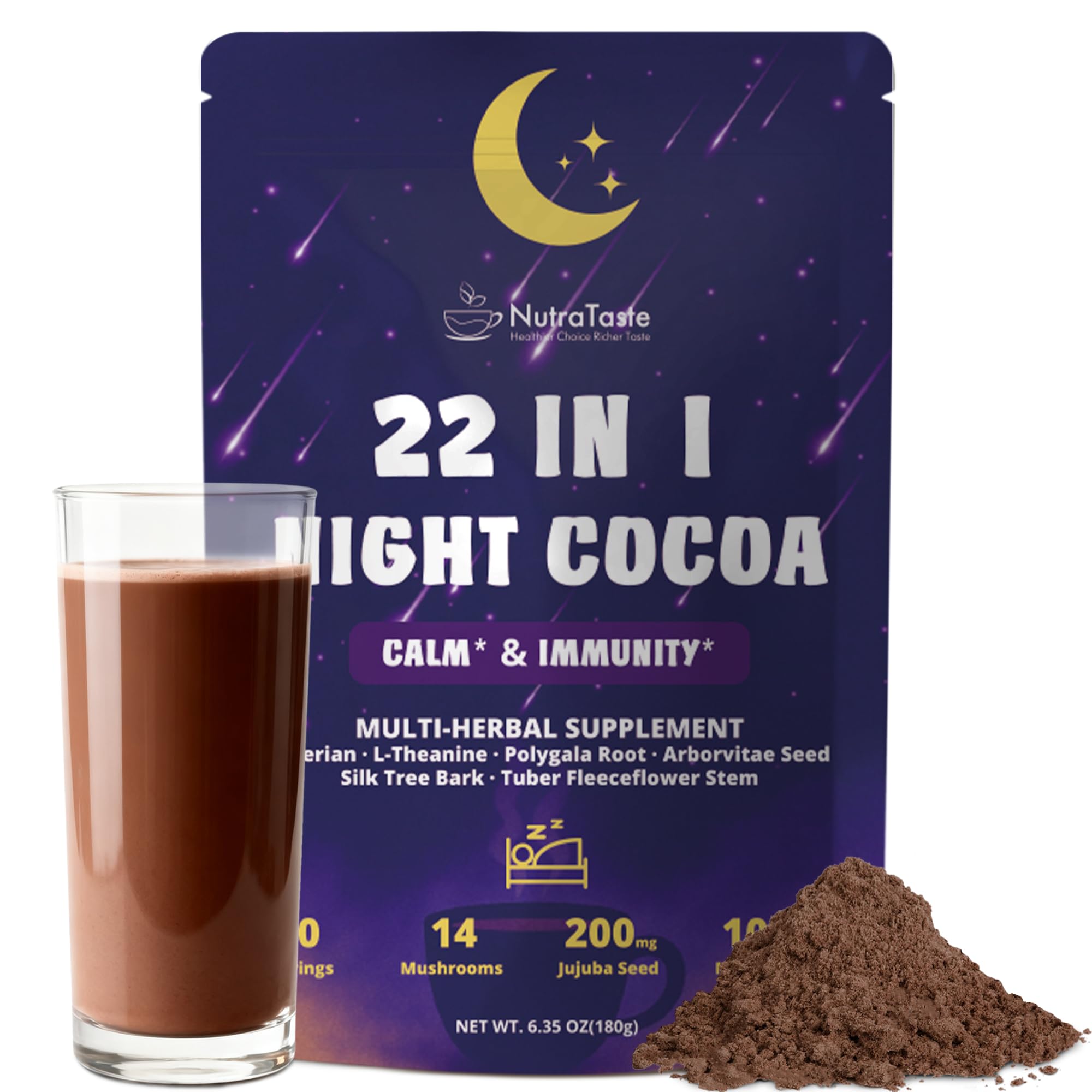 TRUSTED QUALITY CERTIFICATION: Each batch of NutraTaste mushroom hot Cocoa is crafted in GMP-certified facilities to ensure purity, safety, and consistency. Made with Non-GMO, Gluten-Free, and Plant-Based ingredients, free from artificial colors, flavors, and preservatives. Keto-friendly, lab-verified for potency, and designed for clean, reliable night relaxation. EASY DELICIOUS TO ENJOY: Mix one scoop with 6–8 oz of warm milk or plant-based milk. Enjoy a lightly sweet, rich cocoa flavor with hints of herbal smoothness. Perfect for your nightly relaxation ritual or as a caffeine-free hot chocolate alternative. RELAX, CALM SLEEP SUPPORT: This soothing mushroom hot cocoa blend helps support relaxation and deep, restful sleep. Adaptogenic mushrooms and amino acids work together to calm the mind and body, while natural herbs like Jujube Seed and Valerian support overall balance, stress relief, and nighttime comfort. WHY JUJUBE SEED: Jujube Seed is a gentle, time-honored calming herb that supports natural relaxation without dependency or morning grogginess. Unlike melatonin, it works with your body's rhythm for a smoother, more balanced transition into sleep. Paired with cocoa, magnesium, GABA, and L-theanine, it creates a warm, comforting drink that helps quiet the mind and support deep, restful nighttime relaxation. WHY CHOOSE US: Choose a melatonin-free, clean, and truly transparent sleep formula. While many mushroom hot cocoa powders rely on melatonin or underdosed herbs, our blend is crafted with fully disclosed, functional amounts of natural calming ingredients. We combine four gentle sleep-support herbs—Jujube Seed, Valerian, Polygala, and Silk Tree Bark—with Magnesium Glycinate, GABA, L-Theanine, and 14 functional mushroom extracts to create a deeply soothing nighttime drink. This balanced synergy helps quiet the mind, relax the body, ease daily stress, and support deep, restorative sleep—naturally and without morning grogginess.