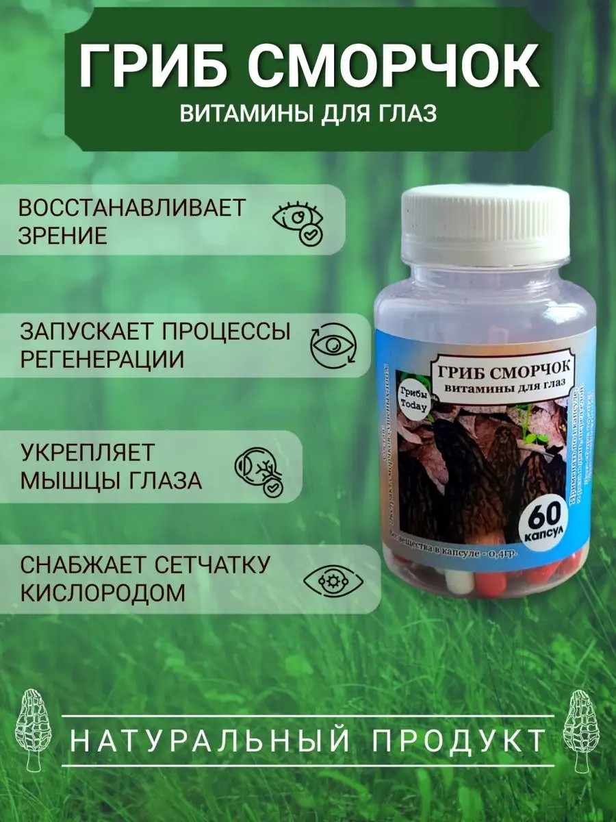 Сморчки -сумчатые грибы с пористой сморщенной шляпкой,относящиеся к семейству моршелловых культур.Гриб оказывает полезное влияние на организм человек за счет содержания биоактивных веществ; зольных соединений.пищевых волокон.витаминов.полисахаридов.микро-и макроэлементов.Помимо кулинарии сморчки используют в народной медицине.На основе данного вида грибов готовят отвары.настои и экстракты.которые применяют для лечения суставных.офтальмологических и гинекологических проблем.Также Сморчок - это новый взгляд на лечение заболеваний глаз без химии и побочных эффектов! Это инновационный метод восстановления зрения без хирургического вмешательства! Эффективное и натуральное средство на основе лечебного гриба сморчок, которое вернет Ваше зрение! Лечебные свойства препарата:- лечение близорукости, дальнозоркости, глаукомы, катаракты;- укрепление и стимуляция глазных мышц;- очищение и осветление хрусталика глаза;- снятие отечности, болевого синдрома, дискомфорта. Если Вы испытываете снижение зрения, усталость глаз, ощущаете "песок" или туман в глазах, а также нуждаетесь в качественной профилактике заболеваний органов зрения, то Сморчок - идеальный вариант именно для Вас! Рекомендуем принимать по 1 капсуле два раза в день.