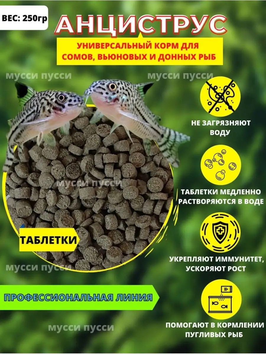 мусси пусси Корм для аквариумных рыбок сомов донных и вьюновых рыб 250 г