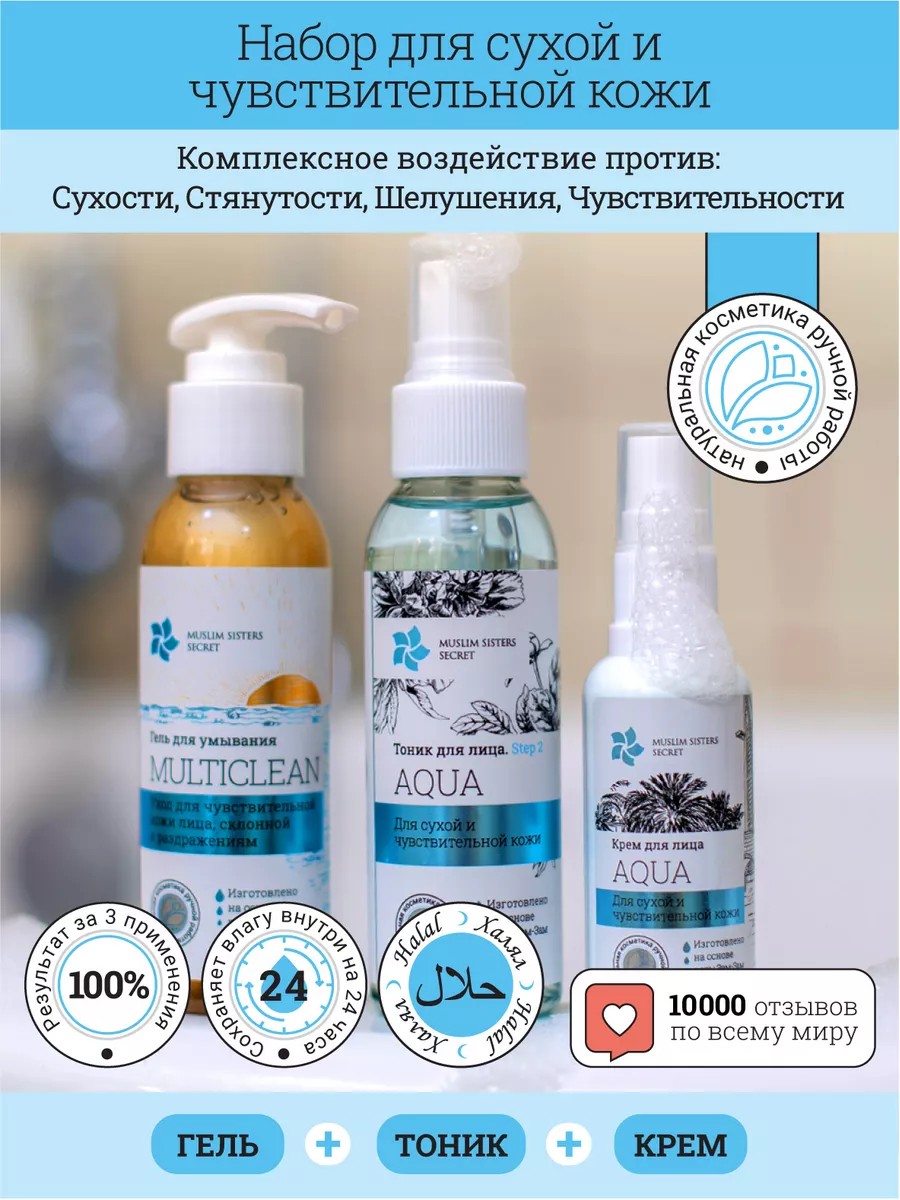 The Muslim Sisters Secret cosmetics set for dry and sensitive skin is a great gift for a loved one and a smart choice of skincare for yourself. The AQUA complex for dry and sensitive skin deeply moisturizes and nourishes, restores the protective layer, and fills wrinkles and fine lines. This is the best skincare set for dry and sensitive skin, with a natural formula and healing zamzam water in each jar. The Multiclean cleansing gel is specially formulated for gentle cleansing and is suitable for those with sensitive, dry, and irritated skin. Thanks to a combination of caring and soothing ingredients, this cleanser gently cleanses, leaving skin feeling soft and comfortable. The product's rich formula provides intense nourishment and softening of the epidermis, restores barrier function, and slows cellular aging. Panthenol and inulin relieve redness and irritation. Aloe leaf, chamomile, and fireweed extracts have broad anti-inflammatory and antibacterial properties. Aqua Tonic perfectly restores natural moisture levels for 24 hours. Its prolonged and deep action gently retains moisture, accelerates cellular metabolism, and actively vitaminizes the epidermis. Halal AQUA cream for dry skin creates a thin, breathable layer that prevents moisture loss and deeply moisturizes for 24 hours. A blend of herbal extracts and oils restores natural sebum levels, stimulating the skin's natural protective functions, providing excellent nourishment and eliminating irritation and flaking. Cocoa butter contains essential vitamins B and E, which improve skin elasticity and have a broad-spectrum toning effect on vascular walls. D-Panthenol nourishes and softens, while allantoin stimulates cell proliferation and heals microcracks. Muslim sisters cosmetics, a cosmetics brand for Muslim women, has developed halal care product, zamzam, which is chemical-free, not tested on animals, and is completely biocompatible with skin.