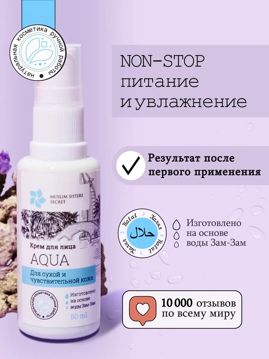 Нежный увлажняющий крем для сухой кожи “AQUA” создает тончайший дышащий слой, препятствующий потере влаги на 24 часа. Композиция натуральных компонентов экстрактов трав и масел восстанавливает естественный уровень кожного сала, стимулируя природные защитные функции кожи. Нежный крем превосходно питает, устраняет раздражение, снимает сухость и шелушение. Благодаря тщательно продуманной формуле эко крем не ощущается на коже, не оставляет масло и липкой пленки. Косметика ручной работы Muslim sisters secret это халяль состав и доказанная эффективность каждого продукта. Масло какао, входящее в состав крема, является ценнейшим источником жирных кислот, так необходимых сухой и обезвоженной коже. Оно содержит группу незаменимых витаминов класса В и Е, пептид и коллаген,которые повышают упругость эпидермиса и оказывают широкое тонизирующее влияние на стенки сосудов. Пантенол и аллантоин моментально смягчают кожу, а обильное содержание витамина B5 способствует разглаживанию мелких морщинок. Вода zamzam стимулирует клеточную полиферацию, обладает заживляющим и успокаивающим воздействием. Крем против сухости Аква – настоящий кладезь витаминов для кожи, так как содержит и необходимый каждой женщине – витамин Е. Его второе название – витамин красоты для кожи. Именно он предотвращает процессы старения и увядания дермы, повышает упругость и эластичность кожи. Крем аква придает коже мягкость и естественное сияние. После применения нашего крема вам не понадобится декоративная косметика. Декоративное косметическое средство хорошо подходит как ежедневный уход, на день и вечер., кроме того это отличная база и основа под макияж. Профессиональная косметика муслим систерс разработана с учетом всех стандартов требований Халяль и подходит мусульманкам любого возраста, которые ценя качество и 100% эффективность уход для дома за лицом. Касметика для лица не содержит химии, подходит для беременных и аллергиков. Крем замзам это идеальный подарок маме,сестре,дочке или бабушке на рамадан,новыйгод