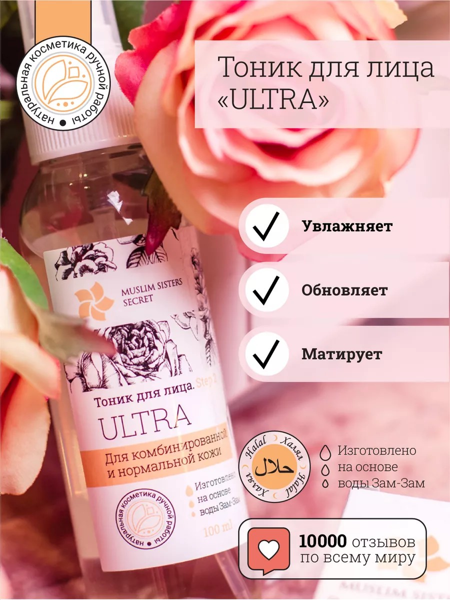 Тоник для лица ULTRA работает по трем направлениям: тонизирует, обновляет и дарит коже ровный матовый тон. Гидролат лаванды предотвращает появление комедонов, снимает локальную сухость, ускоряет клеточный метаболизм, возвращает коже здоровое сияние и упругость. Гидролат вербены обеспечивает дополнительное очищение, тонизацию и восстановление идеального PH-баланса дермы. Гидролат зеленого чая обладает успокаивающим воздействием, устраняет любые виды несовершенств и усиливает кровообращение в тканях. Лосьон превосходно укрепляет стенки сосудов, предотвращая появление купероза и сосудистых звездочек, устраняет обезвоженность отдельных участков лица и регулирует баланс себума. Тщательно продуманная формула мист содержит в себе смягчающие и увлажняющие ингредиенты, превосходно подготавливает кожу к нанесению основного ухода. Ведь именно тонер для лица обеспечивает более быстрый и видимый результат последующего ухода. Крем, сыворотка или концентрат для лица халал впитаются глубже в дерму. Входящая в состав целительная вода зам-зам избавит от чувства стянутости, сухости и шелушения, оставит на ней ощущение приятной влажности. Биотоник для нормальной и жирной кожи изготавливается на основе воды из священного источника зама-зам, ценного для мусульманки каждого уголка мира. Тонер для лица Muslim sisters secret выполняет своего рода дренажную функцию, улучшает циркуляцию крови и лимфы в кожных покровах, так как гидролат - это буквально витаминная настойка для лица. Средство полностью соответствует нормам Халяль косметика замзам, подходит как домашний уход за лицом, не содержит спирта, парабенов, силиконов, фталатов, искусственных красителей и ароматизаторов. Наша косметика Halal от муслим систерс секрет–это бренд ухода за лицом для мусульманок, который рекомендуют тысячи женщин и девушек по всему миру. Это качество российского производства без израильских компонентов. Отличный исламский подарок на любой праздник, для женщин, девушек, ценящих эко косметику без химии.