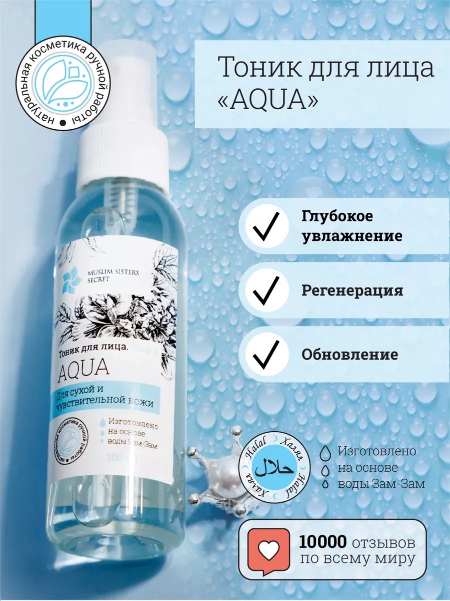 Тоник против сухости AQUA с водой замзам превосходно увлажняет, восстанавливает естественный уровень влаги в клетках кожи и деликатно тонизирует эпидермис. Идеален для сухой и чувствительной кожи в любое время года. Благодаря пролонгированному и глубокому воздействию он бережно сохраняет влагу внутри, ускоряет клеточный метаболизм и активно витаминизирует кожу. Тонер для лица от Muslim sisters secret – это купаж гидролатов и целительная сила воды зам-зам для пленительно мягкой, сияющей и здоровой кожи. Гидролат ромашки обладает заживляющим воздействием, устраняет раздражения и снимает сухость. Гидролат календулы способствует заживлению микротравм на коже, ускоряет восстановление кожи от сухости и шелушения. Гидролат розы используется для женщин с древних времен для поддержания молодости и ровного тона кожи. Отдохнувший, здоровый и сияющий тон кожи – мечта каждой девушки любого возраста. Тонер от zamzamкосметикс, мист, софтнер – по сути одни и теже бьюти продукты, призванные восстановить РН-баланс, оказать тонизирующее воздействие на стенки сосудов, увлажнить и витаминизировать дерму. Любой уходовый продукт после применения миста окажет свое воздействие на 100%, ведь именно тоник помогает проникнуть косметике глубже в эпидермис. Каждый продукт российского бренда профессиональная косметика халяль соответствует нормам Шариата, именно поэтому наш тоник не содержит спирта, красителей и отдушек, может применяться беременным и аллергикам.