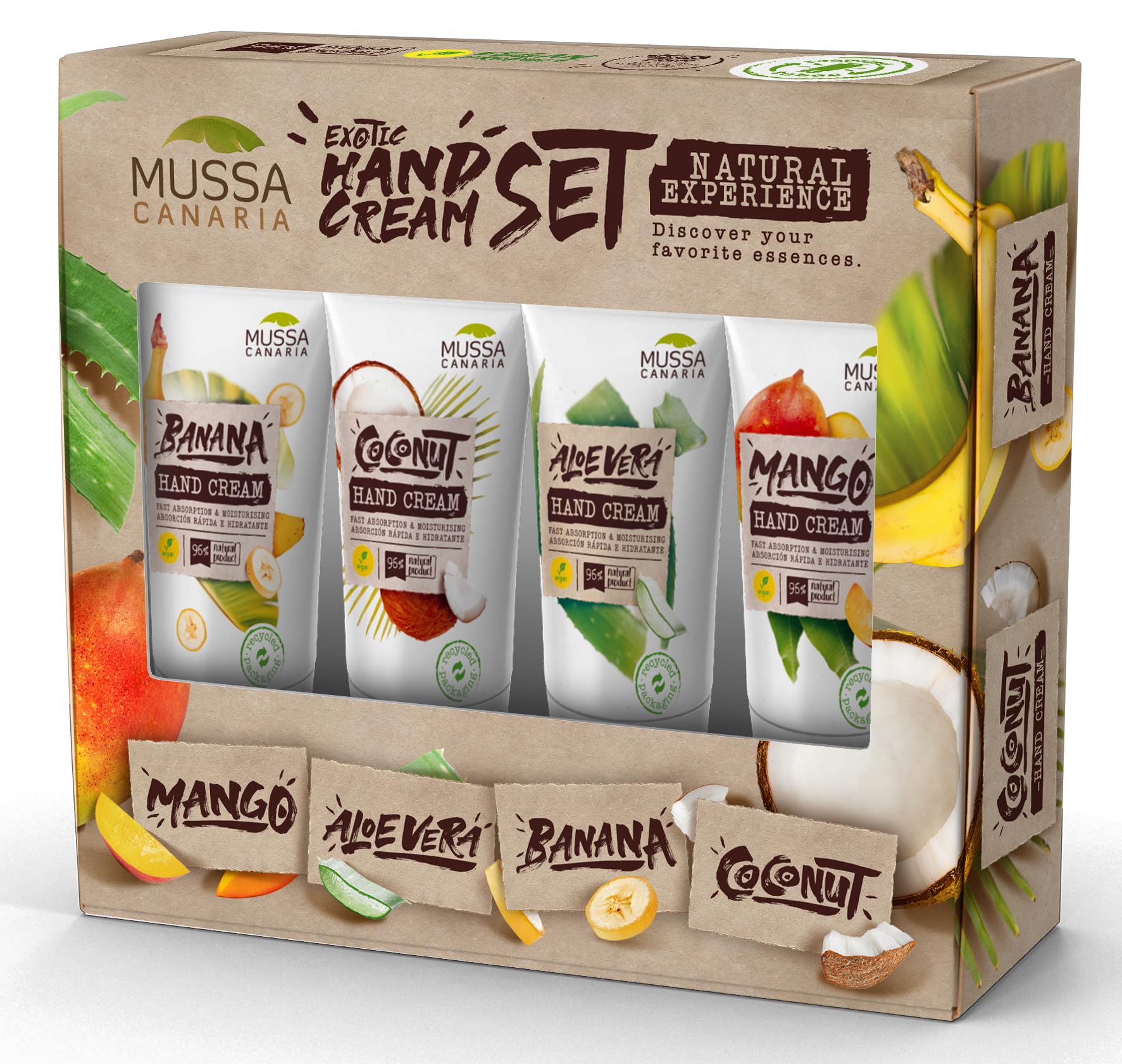 Mussa Cosmetics Natural Hand Cream Set Mango Aloe Vera Banana and Coconut Travel size 4 x 40 ml