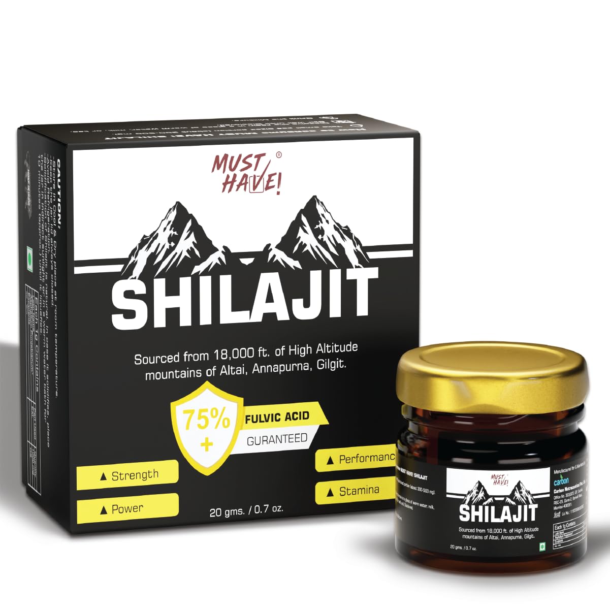 Experience the transformative benefits of MUST HAVE! Shilajit Resin, a potent 20gm formulation enriched with 75 Fulvic Acid. Derived from the pristine Himalayan mountains, Shilajit is revered in Ayurveda for its multifaceted health benefits, making it a cornerstone of natural wellness. MUST HAVE! Shilajit Resin acts as a natural energy booster, helping you combat fatigue and maintain vitality throughout the day. It enhances cognitive function, sharpening mental clarity and focus, which is essential for tackling daily challenges with heightened alertness. Rich in Fulvic Acid, Shilajit Resin supports efficient nutrient absorption in the body, aiding in maximizing the benefits of essential vitamins, minerals, and other nutrients from your diet, promoting overall health and well-being. Shilajit Resin is renowned for its potent antioxidant properties, which combat oxidative stress and free radical damage. These antioxidants help promote skin elasticity, reducing the appearance of fine lines and wrinkles for a more youthful complexion. Regular use of Shilajit supports skin health from within, helping you maintain a radiant and youthful appearance. As a natural resin rich in minerals and bioactive compounds, Shilajit supports cardiovascular health by promoting healthy circulation and cholesterol levels. Its immune-modulating properties strengthen the body's defenses, supporting resilience against infections and seasonal challenges.HEART HEALTH AND IMMUNE SUPPORT: Supporting cardiovascular health, MUST HAVE! Shilajit Resin aids in maintaining healthy circulation and cholesterol levels. Its immune-supportive properties strengthen the body's natural defenses, helping to fortify resilience against environmental stressors and seasonal challenges. ANTI-AGING PROPERTIES: MUST HAVE! Shilajit Resin is infused with potent antioxidants that contribute to maintaining skin elasticity and combating oxidative stress. By supporting skin health from within, it helps to promote a youthful appearance and reduce the visible signs of aging over time. EFFICIENT NUTRIENT ABSORPTION: Rich in Fulvic Acid, MUST HAVE! Shilajit Resin assists in optimizing nutrient absorption from food and supplements. This helps the body better utilize essential vitamins, minerals, and nutrients, contributing to overall health and vitality. COGNITIVE FUNCTION SUPPORT: This resin aids in enhancing cognitive function by promoting mental clarity and focus. By supporting brain health, MUST HAVE! Shilajit Resin helps to maintain sharpness and cognitive agility, crucial for tackling daily tasks and maintaining mental acuity. NATURAL ENERGY BOOSTER: MUST HAVE! Shilajit Resin provides a natural boost to energy levels, helping to sustain vitality throughout the day without the jitters or crashes associated with caffeine. It supports physical endurance and mental alertness, making it ideal for maintaining productivity and overall well-being. INCREASES STRENGTH STAMINA: MUST HAVE! Shilajit Resin, enriched with natural compounds like Fulvic Acid and potent botanical extracts, supports enhanced strength and stamina. It helps improve endurance levels, promoting physical performance and overall stamina without artificial stimulants.
