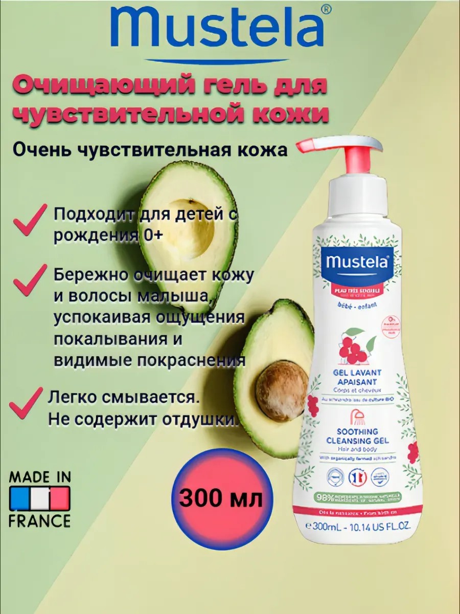Флакон с помпой обеспечивает удобство использования и экономичность, позволяя применять нужное количество средства без лишних затрат. MUSTELA Гель для купания детей для чувствительной кожи в объеме 300 мл – это продукция, произведенная во Франции, которая сочетает высокое качество и натуральные компоненты, обеспечивая вашему ребенку надежный уход и защиту. Забота о здоровье и комфорте вашего малыша становится простой задачей с гелем MUSTELA с экстрактом органической Шизандры.