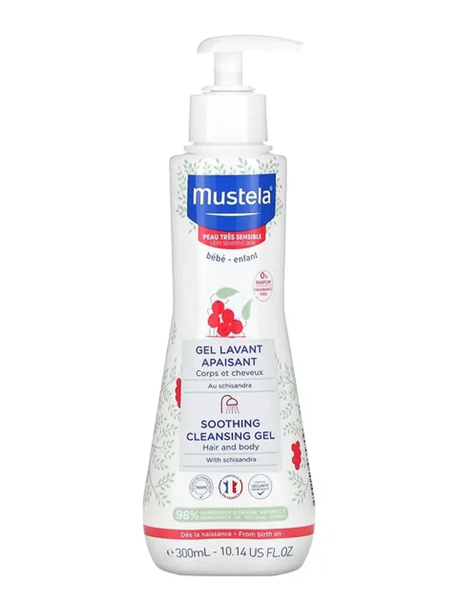 This specially formulated soothing cleansing gel for body and hair, Mustela, in a 300 ml volume, gently cares for even the most sensitive skin, providing gentle cleansing and comfort for baby's skin after bathing, including the use of hard water.