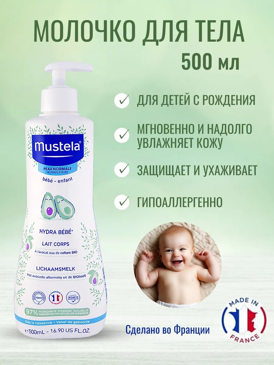 Детское увлажняющее молочко для тела Mustela Hydra Bebe 500 мл. Нежное увлажняющее молочко для детской кожи от Mustela — это идеальный выбор для ухода за чувствительной кожей малыша. Средство подходит для использования с первых дней жизни.