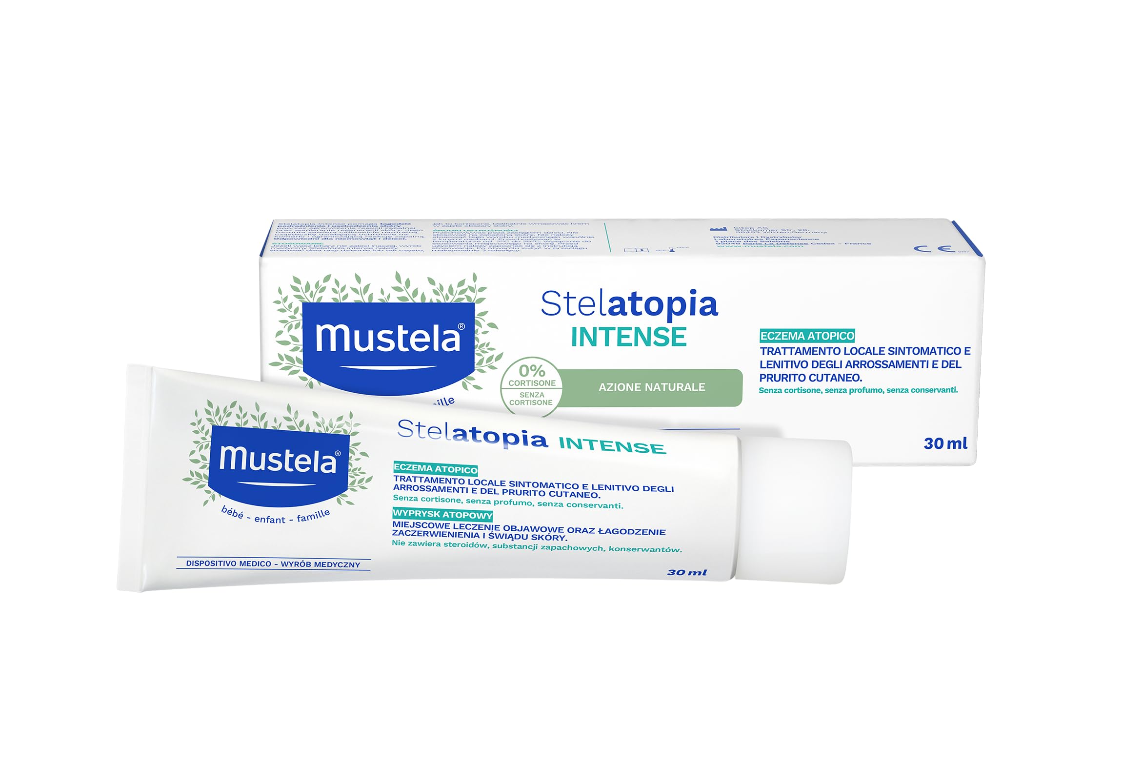 Mustela Stelatopia Intense is a natural, cortisone-free treatment for atopic eczema of the face and body. It is a symptomatic local treatment that relieves redness and itching and is also indicated as monotherapy for the symptoms of mild to moderate atopic dermatitis. It can be used to treat flare-ups. Safe from birth: tested under dermatological and pediatric supervision on atopic skin. Hypoallergenic: to minimize the risk of allergic reactions. Certified as a medical device (ON 0197). Ingredients: Ectoine has anti-inflammatory properties and protects lipid membranes. Also contains Ceramides (lipids), Squalane (sebum component), Olive Oil, and Shea Butter. Directions for use: Apply a walnut-sized amount to the irritated area twice a day or as often as needed. Gently massage the cream into the irritated skin until completely absorbed. If the skin condition worsens during treatment or does not improve even after prolonged use, discontinue use and consult your doctor or pharmacist. Contains 99 ingredients of natural origin the remaining 1 are highly tolerated ingredients. Free of parabens, preservatives, cortisone, and fragrance. SAFETY WARNING: For external use only. Avoid contact with eyes. Keep away from open flames and direct heat sources.Natural treatment for atopic eczema of the face and body, without cortisone. Relief of redness and itching also as monotherapy for mild to moderate symptoms of atopic dermatitis. Contains 99 ingredients of natural origin, the remaining 1 are ingredients with a high tolerance. Free from parabens, preservatives, cortisone, perfume. Suggested use: apply a small amount of the product to the irritated area twice a day or as often as necessary. Gently massage the cream into the irritated skin until completely absorbed. Ectoin has anti-inflammatory properties and protects lipid membranes. Also contains Ceramides (lipids), Squalani (sebum component), Olive Oil and Shea Butter. Safe from birth: dermatologically and pediatrically tested on atopic skin. Hypoallergenic: to minimize the risk of allergic reactions. EC medical device (ON 0197). Natural treatment for atopic eczema of the face and body, without cortisone. Relief of redness and itching also as monotherapy for mild to moderate symptoms of atopic dermatitis.Mustela Stelatopia Intense Atopisch Eczeem Huidcrème, Olijfolie en Sheaboter, Gezicht en Lichaam, Baby's, Kinderen, Hele Familie - Verlicht roodheid en jeuk, Cortisonvrij (30ml) Stelatopia Intense van Mustela is een natuurlijke behandeling voor atopisch eczeem van de gezichts- en lichaamshuid, zonder cortisone. Symptomatische lokale behandeling die verlichting geeft bij roodheid en jeuk, ook geïndiceerd als monotherapie voor de symptomen van milde tot matige atopische dermatitis. Kan worden gebruikt om de symptomen van flare-ups te behandelen. Veilig vanaf de geboorte: getest onder dermatologische en pediatrische controle op atopische huid. Hypoallergeen: om het risico op allergische reacties te minimaliseren. EG medisch hulpmiddel (ON 0197). Ingrediënten. Ectoïne heeft ontstekingsremmende eigenschappen, beschermt de lipidemembranen. Bevat ook Ceramiden (lipiden), Squalani (talgcomponent), Olijfolie en Sheaboter. Gebruiksadvies: breng twee keer per dag of zo vaak als nodig een hoeveelheid ter grootte van een walnoot aan op het geïrriteerde gebied. Masseer de crème zachtjes in de geïrriteerde huid totdat deze volledig is opgenomen. Als de huidaandoening tijdens de behandeling verergert of zelfs na langdurig gebruik niet verbetert, stop dan met de behandeling en raadpleeg je arts of apotheker. Bevat 99 ingrediënten van natuurlijke oorsprong, de overige 1 zijn sterk getolereerde ingrediënten. Vrij van parabenen, conserveringsmiddelen, cortisonen en parfum. VEILIGHEIDSWAARSCHUWING Alleen voor uitwendig gebruik. Vermijd contact met de ogen. Verwijderd houden van open vuur of directe warmtebronnen.Natuurlijke behandeling voor atopisch eczeem van gezicht en lichaam, zonder cortisone. Verlichting van roodheid en jeuk ook als monotherapie bij milde tot matige symptomen van atopische dermatitis. Bevat 99 ingrediënten van natuurlijke oorsprong, de overige 1 zijn ingrediënten met een hoge tolerantie. Vrij van parabenen, conserveringsmiddelen, cortisonen, parfum. Gebruiksadvies: breng twee keer per dag of zo vaak als nodig een kleine hoeveelheid van het product aan op de geïrriteerde zone. Masseer de crème zachtjes in de geïrriteerde huid totdat deze volledig is opgenomen. Ectoïne heeft ontstekingsremmende eigenschappen en beschermt de lipidemembranen. Bevat ook Ceramiden (lipiden), Squalani (talgbestanddeel), Olijfolie en Sheabutter. Veilig vanaf de geboorte: dermatologisch en pediatrisch getest op de atopische huid. Hypoallergeen: om het risico op allergische reacties te minimaliseren. EG medisch hulpmiddel (ON 0197). Natuurlijke behandeling voor atopisch eczeem van gezicht en lichaam, zonder cortisone. Verlichting van roodheid en jeuk ook als monotherapie bij milde tot matige symptomen van atopische dermatitis.