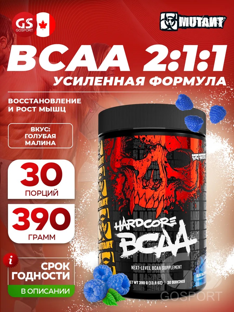 Годен до 31.03.2028. БСАА HARDCORE BCAA 390 г, Голубая малина. Выкладывайтесь на полную на каждой тренировке с невероятной формулой BCAA + электролиты в составе Hardcore BCAA, повышающей производительность. Принимайте Hardcore BCAA во время тренировки или после нее, чтобы повысить производительность и выносливость, поддерживать анаболический уровень, защищать мышцы и быстрее восстанавливаться.Никакой волшебной пыльцы и слабой дозировки. Hardcore BCAA содержит 8 граммов BCAA, 1,7 грамма других вспомогательных аминокислот и 1,04 грамма электролитов. Как будто этого было недостаточно, чтобы сделать эту превосходную добавку BCAA для повышения производительности, мы также добавили мощный фирменный ингредиент, который максимально увеличивает усвоение этих ингредиентов.В отличие от многих дешёвых добавок BCAA, Mutant использует 100% веганские ферментированные аминокислоты вместо привычных птичьих перьев, а иногда и волос!8 г смеси Hardcore BCAAВ большинстве добавок BCAA содержится всего пара граммов BCAA, а в некоторых супер-успевающих — 7 граммов. В хардкорных BCAA содержится целых 8 граммов BCAA, которые дают максимальный прирост. В смеси хардкорных BCAA содержится идеальное, клинически изученное соотношение BCAA 2:1:1, где лейцин является наиболее значимым BCAA, за ним следуют изолейцин и валин. Лейцин — главный, когда дело доходит до запуска процесса синтеза мышечного белка — важнейшего процесса восстановления и роста мышц! И изолейцин, и валин поддерживают работу лейцина и общий процесс синтеза белка.1.7 г Производительность и восстановлениеГлицин, глутамин и аланин — это незаменимые аминокислоты высшего уровня, способствующие восстановлению мышц и повышению их производительности. Вместе эти аминокислоты поддерживают вашу работоспособность во время тренировок, повышая выносливость и энергию мышц. Эти аминокислоты продолжают активно работать и после тренировок, способствуя восстановлению мышц и поддержанию здоровья суставов и соединительной ткани.1,04 г электролитной смесиЭта электролитная смесь получена из семи высококачественных источников, включая фирменный ингредиент Albion Bisglycinate. Правильная гидратация во время тренировки может стать решающим фактором между эпической тренировкой и полным провалом. Ключевые электролиты в составе Hardcore BCAA поддерживают оптимальный баланс жидкости в организме во время интенсивных тренировок, что предотвращает множество неблагоприятных последствий, таких как мышечные спазмы, судороги, слабость, головные боли, снижение выносливости, силы и усиление мышечной боли после тренировк