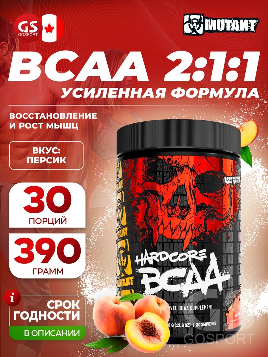 Expires until March 1, 2028. HARDCORE BCAA 390 g, Peach. Give it your all in every workout with the incredible BCAA + electrolyte formula in Hardcore BCAA, which boosts performance. Take Hardcore BCAA during or after your workout to enhance performance and endurance, maintain anabolic levels, protect muscle, and recover faster. No magic pollen or weak dosages. Hardcore BCAA contains 8 grams of BCAAs, 1.7 grams of other supporting amino acids, and 1.04 grams of electrolytes. As if that weren't enough to make this a superior performance-enhancing BCAA supplement, we've also added a powerful proprietary ingredient that maximizes the absorption of these ingredients. Unlike many cheap BCAA supplements, Mutant uses 100% vegan fermented amino acids instead of the usual bird feathers and sometimes hair! 8g Hardcore BCAA Blend: Most BCAA supplements contain only a couple of grams of BCAAs, while some super-performers contain as much as 7 grams. Hardcore BCAA contains a whopping 8 grams of BCAAs, which deliver maximum gains. Hardcore BCAA Blend contains the ideal, clinically studied 2:1:1 BCAA ratio, with leucine being the most significant BCAA, followed by isoleucine and valine. Leucine is king when it comes to activating muscle protein synthesis—the most important process for muscle recovery and growth! Both isoleucine and valine support leucine function and overall protein synthesis. 1.7g Performance & Recovery Glycine, glutamine, and alanine are premium essential amino acids that promote muscle recovery and performance. Together, these amino acids support your performance during training, increasing muscle endurance and energy. These amino acids continue to work actively after training, promoting muscle recovery and maintaining healthy joints and connective tissue. 1.04g Electrolyte Blend This electrolyte blend is derived from seven high-quality sources, including the signature ingredient Albion Bisglycinate. Proper hydration during training can mean the difference between an epic workout and a complete disaster. The key electrolytes in Hardcore BCAA maintain optimal fluid balance during intense training, which prevents a variety of adverse effects such as muscle cramps, cramps, weakness, headaches, decreased endurance, strength, and increased muscle soreness after training.