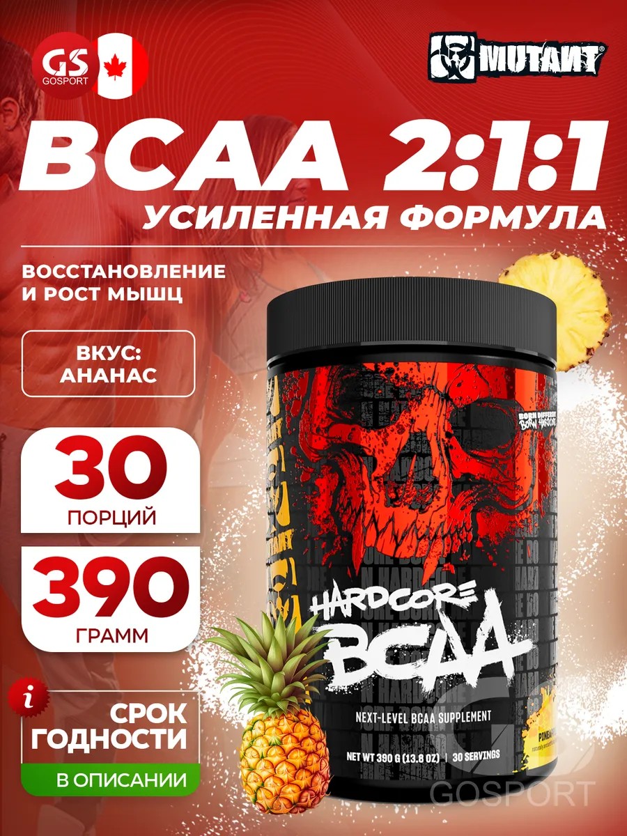 Годен до 01.03.2028. БСАА HARDCORE BCAA 390 г, Ананас. Выкладывайтесь на полную на каждой тренировке с невероятной формулой BCAA + электролиты в составе Hardcore BCAA, повышающей производительность. Принимайте Hardcore BCAA во время тренировки или после нее, чтобы повысить производительность и выносливость, поддерживать анаболический уровень, защищать мышцы и быстрее восстанавливаться.Никакой волшебной пыльцы и слабой дозировки. Hardcore BCAA содержит 8 граммов BCAA, 1,7 грамма других вспомогательных аминокислот и 1,04 грамма электролитов. Как будто этого было недостаточно, чтобы сделать эту превосходную добавку BCAA для повышения производительности, мы также добавили мощный фирменный ингредиент, который максимально увеличивает усвоение этих ингредиентов.В отличие от многих дешёвых добавок BCAA, Mutant использует 100% веганские ферментированные аминокислоты вместо привычных птичьих перьев, а иногда и волос!8 г смеси Hardcore BCAAВ большинстве добавок BCAA содержится всего пара граммов BCAA, а в некоторых супер-успевающих — 7 граммов. В хардкорных BCAA содержится целых 8 граммов BCAA, которые дают максимальный прирост. В смеси хардкорных BCAA содержится идеальное, клинически изученное соотношение BCAA 2:1:1, где лейцин является наиболее значимым BCAA, за ним следуют изолейцин и валин. Лейцин — главный, когда дело доходит до запуска процесса синтеза мышечного белка — важнейшего процесса восстановления и роста мышц! И изолейцин, и валин поддерживают работу лейцина и общий процесс синтеза белка.1.7 г Производительность и восстановлениеГлицин, глутамин и аланин — это незаменимые аминокислоты высшего уровня, способствующие восстановлению мышц и повышению их производительности. Вместе эти аминокислоты поддерживают вашу работоспособность во время тренировок, повышая выносливость и энергию мышц. Эти аминокислоты продолжают активно работать и после тренировок, способствуя восстановлению мышц и поддержанию здоровья суставов и соединительной ткани.1,04 г электролитной смесиЭта электролитная смесь получена из семи высококачественных источников, включая фирменный ингредиент Albion Bisglycinate. Правильная гидратация во время тренировки может стать решающим фактором между эпической тренировкой и полным провалом. Ключевые электролиты в составе Hardcore BCAA поддерживают оптимальный баланс жидкости в организме во время интенсивных тренировок, что предотвращает множество неблагоприятных последствий, таких как мышечные спазмы, судороги, слабость, головные боли, снижение выносливости, силы и усиление мышечной боли после тренировк