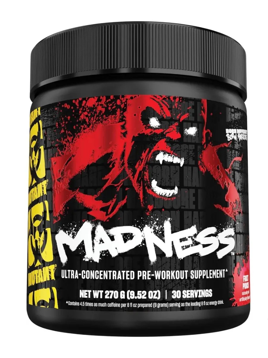 Mutant MADNESS - это предтренировочный комплекс, который предназначен для усиления физического потенциала организма перед тренировкой. Даёт мощный прилив энергии для новых рекордов. Создан на основе аргинина, цитруллина и бета-аланина. Увеличивает выносливость, эффективно борется с усталостью во время тренировки. Разработан специально для супер-интенсивных нагрузок. Входящая в состав предтреника специальная кофеиновая смесь, включает в себя пять источников кофеина, благодаря чему убирает любую усталость и позволяет тренироваться больше и дольше. Способствует производству АТФ - основного источника энергии для работающих мышц. Продукт содержит кофеин, бета-аланин.