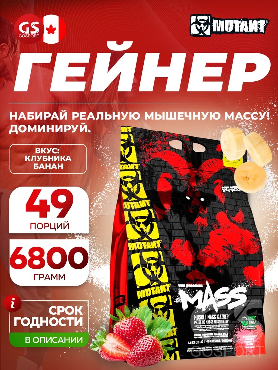 Годен до 31.12.2027. Гейнер Mass 6800 г, Клубника-банан. Гейнер Мутант Масс, без сомнений, является самой совершенной и эффективной добавкой для набора веса в мире! Гейнер - это высококалорийный, легко и быстроусвояемый белково-углеводный продукт, предназначенный для использования в качестве дополнительного приема пищи или как заменителя пищи для поднятия общей калорийности рациона на этапе набора мышечной массы. Способствует восстановлению и росту мышечной массы. Углеводная смесь обеспечивает немедленное поступление энергии и повышает выносливость во время интенсивных силовых тренировок. Гейнер Mutant Mass снабжает организм отличным сочетанием белков, углеводов и полезных жиров и другими анаболиками, необходимыми для максимального роста мышц, увеличения силы и восстановления. Используя Мутант гейнер, вы можете быть спокойны, что быстро наберёте «качественную» массу! Mutant Mass содержит полный набор аминокислот, необходимых для синтеза мышечного белка. Этот спортпит можно использовать не только для набора веса, но и как дополнительный источник аминокислот BCAA. Формула для сухой массы содержит исключительное количество (52 г) аминокислот в порции. Матрица калорий INTRASORB-5 включает молозиво и комплекс Insu-Drive Complex, являющийся запатентованным водным экстрактом корицы Циннулин-PF, обеспечивающим высокую эффективность инсулина и работу пищеварительной системы, таким образом, увеличивая поглощение питательных веществ мышцами. Mutant Mass гейнер является компонентом профессионального спортивного питания для спортсменов и людей, занимающихся спортом или фитнесом. Продукт подходит для мужчин и женщин, заботящихся о своем здоровье и красоте. Рекомендации по приготовлению пищевой добавки: взболтайте в шейкере или смешайте в миксере 4 мерных ложки порошка с 480-960 мл воды или молока. Рекомендуется принимать по 2, а в некоторых случаях (высокая потребность в белке) 3 коктейля в день. Излюбленный режим заключается в приёме одного коктейля утром после пробуждения и второго сразу после тренировки; или в любое другое время когда вам захочется получить дополнительную порцию белка. Легко смешивается и имеет очень приятный вкус.