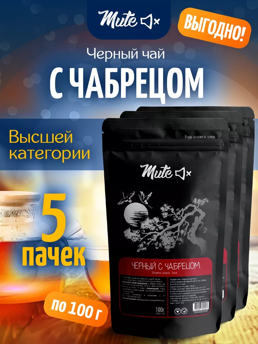 Mute Черный чай листовой с чабрецом, 100 г. х 5 шт