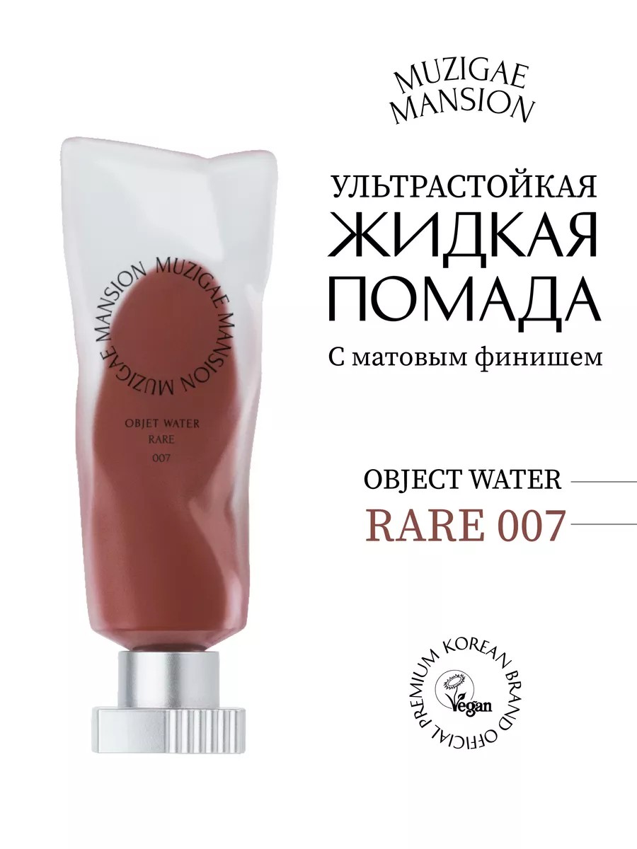 MUZIGAE MANSION Objet Water ultra-long-lasting liquid lipstick with a matte finish. Product 007 RARE, it has a diffused gel texture that imparts a light-reflecting hue and a lightweight finish. The Object Water collection features vibrant shades for the boldest girls! How to use: Apply the desired amount to lips from the inside out using the applicator. Composition: Dimethicone, Cyclopentasiloxane, Dimethicone/Vinyl Dimethicone Crosspolymer, Polyglyceryl-2 Triisostearate, Dimethicone Crosspolymer, Synthetic Fluorphlogopite, Kaolin, etearyl Dimethicone Crosspolymer, Titanium Dioxide, HDI/Trimethylol Hexyllactone Crosspolymer, Methyl Methacrylate Crosspolymer, 1,2-Hexanediol, Backhousia Citriodora Leaf Extract, Thymus Vulgaris (Thyme) Extract, Rosa Canina Fruit Oil, Ethylhexylglycerin, Diisostearyl Malate, Silica, Distearyldimonium Chloride, Water, Tocopherol, Methylpropanediol, Fragrance, Iron Oxide Red, Tartrazine, Iron Oxide Black, Lithol Rubine BCA,