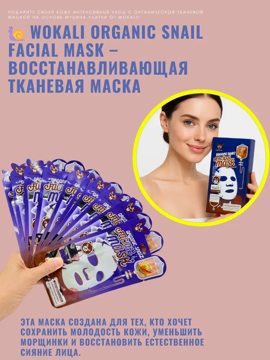 Маска WOKALI разработана для тех, кто ценит качество, эффективность и комфорт. Благодаря активному компоненту — муцину улитки, она глубоко увлажняет, восстанавливает и дарит коже упругость и сияние.
