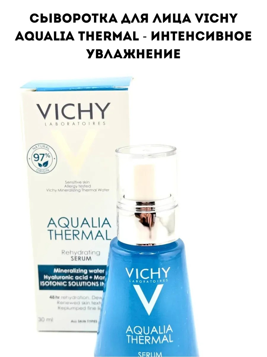 Сыворотка содержит гиалуроновую кислоту и минерализующую термальную воду VICHY, которые помогают удерживать влагу в клетках кожи, делая её более гладкой и напитанной. Продукт подходит для всех типов кожи, включая чувствительную.