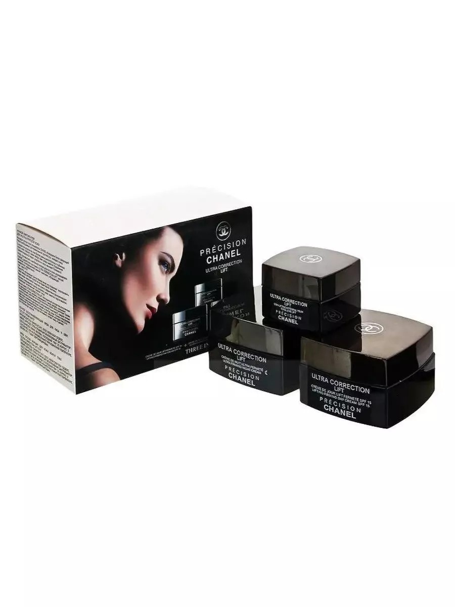 Chanel Ultra Correction Lift 3-in-1 Cream Set. Chanel Precision Ultra Correction Lift Night Cream restores skin overnight through natural cellular lifting. Skin firmness is restored, and facial contours are evened out. The velvety texture glides on gently, instantly smoothing and firming the skin. Chanel Precision Ultra Correction Lift Total Eye Cream effectively conceals signs of fatigue, firms the skin, and leaves it looking youthful and radiant. Lifting eye care is a crucial step in any skin restoration program. The delicate texture of the cream envelops the skin around the eyes, concealing bags and eliminating dark circles. Thanks to the Chanel lifting complex, the skin acquires a healthy and toned appearance.