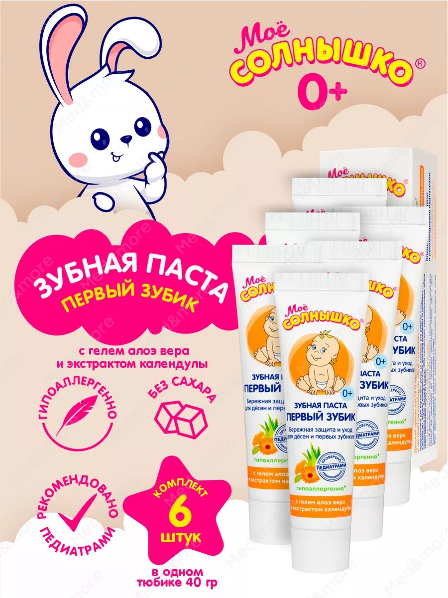 Зубная паста детская Мое Солнышко Первый зубик 6 шт - предназначена специально для ухода за зубами малышей с первых дней жизни. Эта паста обеспечивает особый уход за деснами и зубками малыша с самого начала их появления. Благодаря своему мягкому, гипоаллергенному составу, она безопасна для детей от 0 до 2 лет и не содержит фтора, отдушек, красителей и сахара, что делает её идеальным выбором для самых маленьких.