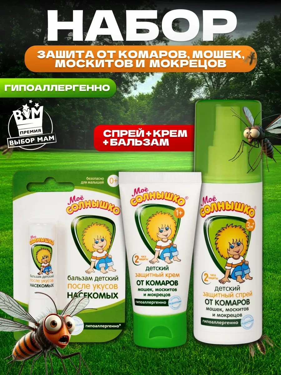 | Комплектация | Детский крем от комаров 55мл; Бальзам после укусов комаров 1 шт; Детский Спрей от комаров с 3-х месяцев 100 мл |