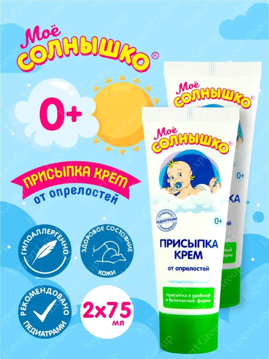 Присыпка-крем от опрелостей Гипоаллергенно для детей с рождения Моё Солнышко 75 мл. х 2 штуки. Детская присыпка в форме крема, содержащая оксид цинка, быстро превращается в шелковистый тальк, который не скатывается в складочках нежной детской кожи. Эффективно подсушивает и поддерживает здоровое состояние кожи. Подходит для малышей с первых дней жизни. Гипоаллергенно. Формула создана для сведения к минимуму риска аллергической реакции в случае индивидуальной непереносимости ингредиентов состава.