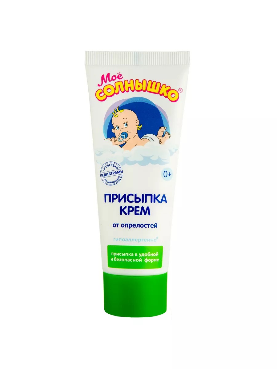 Присыпка-крем от опрелостей Мое Солнышко 75 мл. Для ухода за кожей малыша с первых дней жизни, быстро превращается в шелковистый тальк, который долго сохраняется на коже, предотвращает и устраняет раздражения, покраснения и опрелости. Детская присыпка в форме крема, в отличие от обычной присыпки, не скатывается на коже и обеспечивает более комфортное и безопасное применение, исключающее попадание порошкообразного талька в дыхательные пути малыша. Оксид цинка оказывает подсушивающее и противовоспалительное действие в складочках нежной детской кожи, в местах воспалений.