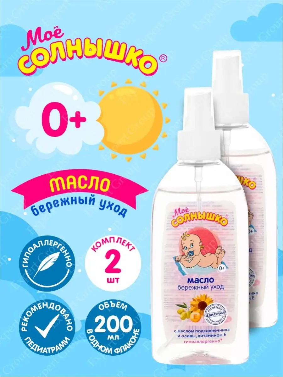 Moe Solnyshko Gentle Care Baby Oil, 200 ml. Suitable for babies from birth. Thanks to sunflower and olive oils, as well as vitamin E, it gently cares for, intensely moisturizes, and leaves skin soft and silky. Provides prolonged glide over the skin and can be used for massage on children from birth and adults. Paraben- and dye-free. Hypoallergenic.