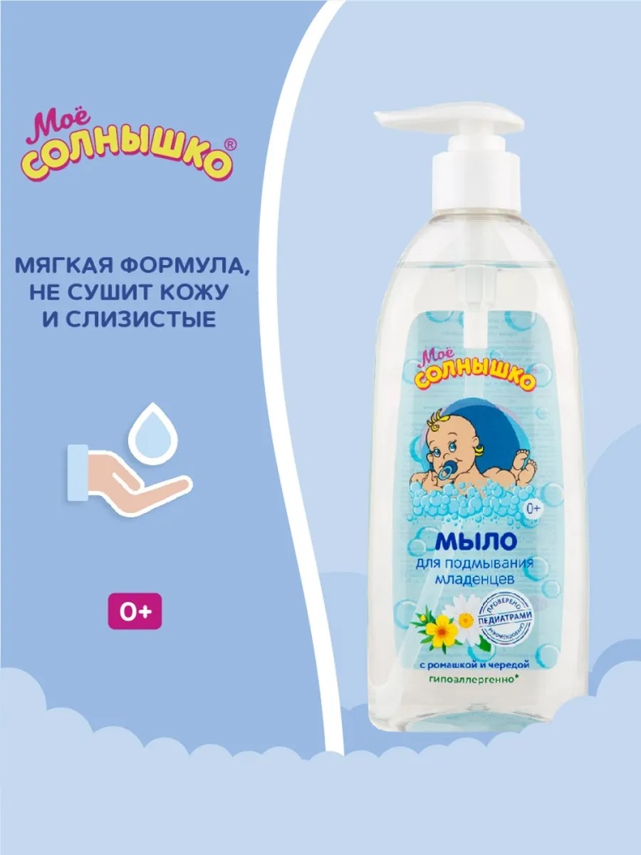 Мыло для подмывания младенцев с ромашкой и чередой серии Мое солнышко 400 мл. Бережно очищает кожу младенца при каждой смене подгузника и перед сном. Мягкий состав не сушит нежную кожу и не раздражает слизистые. Содержит экстракты цветков ромашки и череды, способствует поддержанию кожи малыша в зоне подгузника в здоровом состоянии. Подходит для малышей с первых дней жизни. Гипоаллергенно. Сбалансировано по показателю рН.