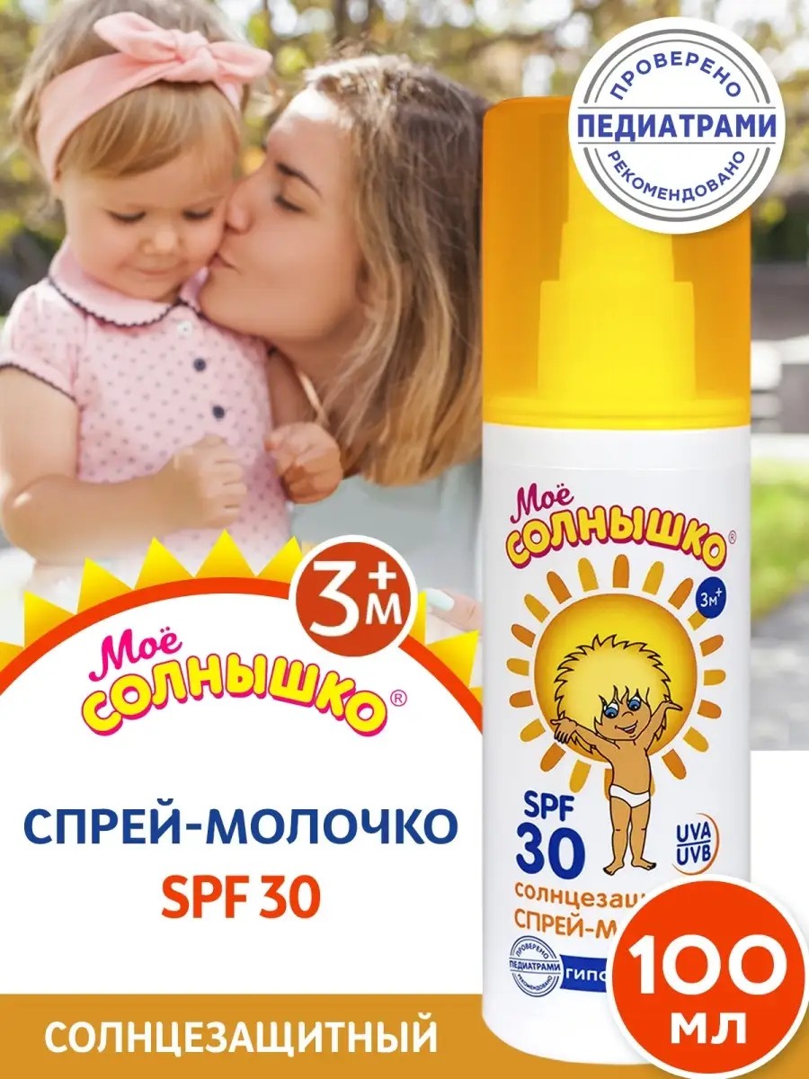 Детский солнцезащитный спрей-молочко SPF 30 «Мое солнышко» – максимальная степень защиты. Объемом 100 мл. Средство разработано для обеспечения безопасности нежной кожи малыша от воздействия вредных солнечных лучей. Детскую кожу нужно максимально оберегать, поскольку кожный иммунитет формируется примерно к 12 годам, и у малышей нет специфической защиты, которая есть у взрослых. Молочко в виде спрея с индексом 30 даёт эффективную защиту от солнца, он блокирует до 98% лучей. Спасает от термических ожогов. Косметика содержит гипоаллергенные фильтры, которые в сочетании с витамином Е и экстрактом календулы обеспечивают длительную сверхвысокую защиту от широкого спектра UVA/UVB излучения. Интенсивно смягчает кожу, предохраняет ее от пересушивания и препятствует потере влаги. Подходит для детей с 3 месяцев. Водостойкий крем спф 30 эффективен во время купания. Если ребенок много времени проводит в воде рекомендовано повторно наносить санскрин на лицо и тело, чтобы максимально гарантировать защиту от УФ излучения, тем самым предотвращая фотостарение кожи, солнечные ожоги и злокачественные изменения. Способ применения: обильно наносить крем на все открытые участки кожи, не забывая об ушных раковинах, внутренней поверхности рук и ног, ладонях. Выходить на улицу не раньше, чем спустя 15-30 минут после нанесения солнцезащитного средства. Оставаясь на открытом воздухе, наносить солнцезащитный крем каждые 2-3 часа. Не забывать, что лучи типа А достигают кожу и сквозь тучи, и сквозь стекло.