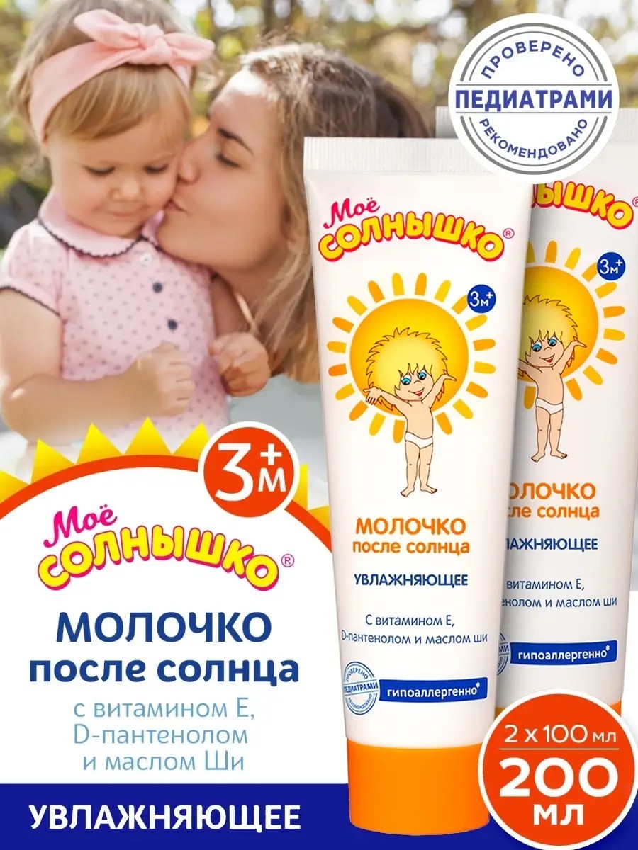 Детское молочко после солнца «Мое солнышко» – быстрое восстановление после длительного пребывания под УФ-излучением. В наборе 2 уходовых средства объемом по 100 мл. Детская косметика разработана для обеспечения быстрой регенерации нежной кожи малыша после воздействия вредных солнечных лучей. Детскую кожу нужно максимально оберегать, поскольку кожный иммунитет формируется примерно к 12 годам, и у малышей нет специфической защиты, которая есть у взрослых. Молочко содержит эффективный комплекс витаминов Е и растительных экстрактов с бисабололом, который оказывает смягчающее и увлажняющее действие, успокаивает кожу после действия УФ тлучей и нормализует ее защитные функции. Интенсивно смягчает кожу, предохраняет ее от пересушивания и препятствует потере влаги. Д пантенол в составе стимулирует регенерацию кожи, нормализует клеточный метаболизм, увеличивает прочность коллагеновых волокон. Оказывает регенерирующее, слабое противовоспалительное действие, питает и смягчает кожу. Масло ши и масло семян моркови обеспечивают дополнительную защиту от возможного воздействия солнца после загара.