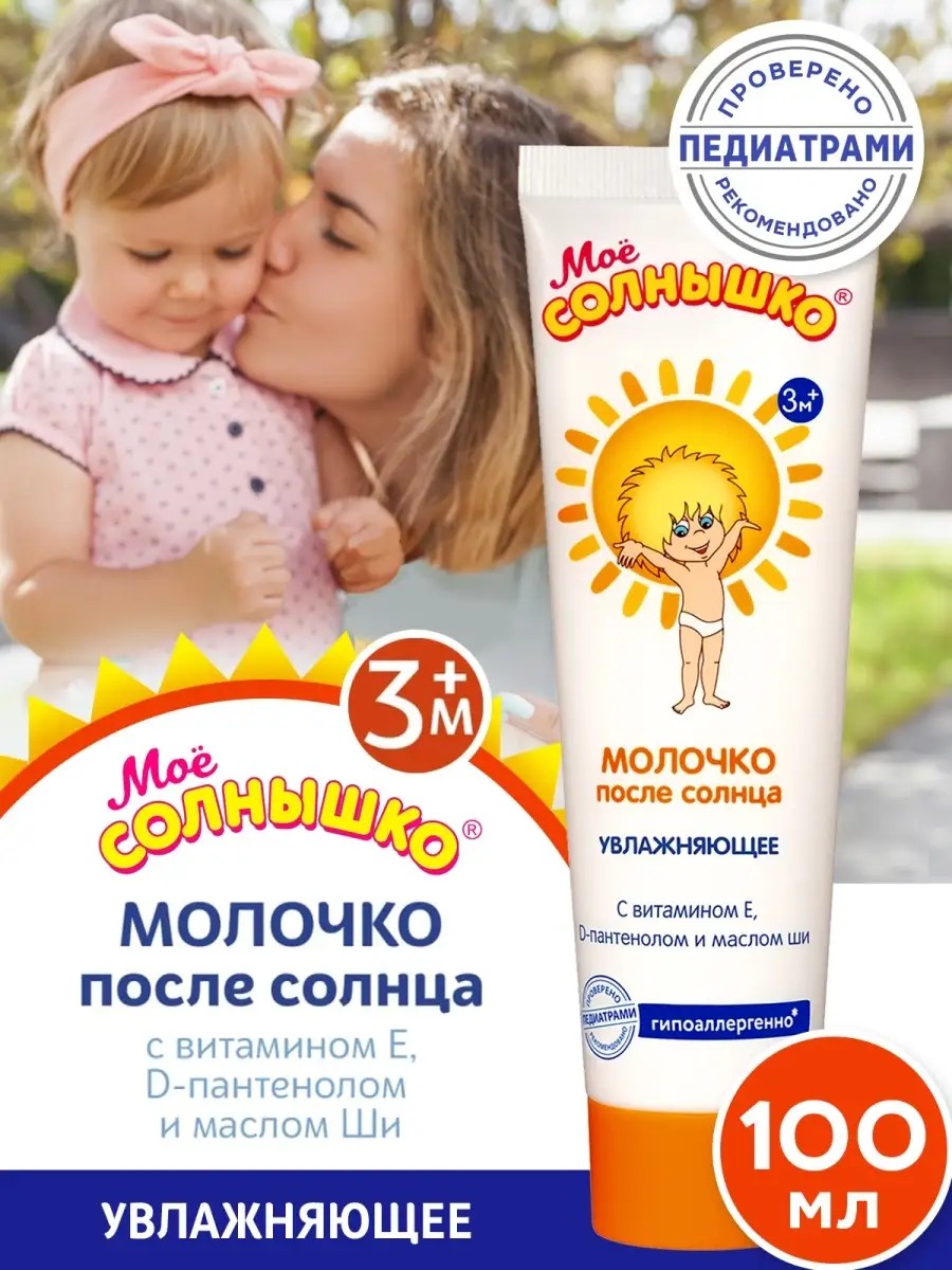 Детское молочко после солнца «Мое солнышко» – быстрое восстановление после длительного пребывания под УФ-излучением. Объем 100 мл. Детская косметика разработана для обеспечения быстрой регенерации нежной кожи малыша после воздействия вредных солнечных лучей. Детскую кожу нужно максимально оберегать, поскольку кожный иммунитет формируется примерно к 12 годам, и у малышей нет специфической защиты, которая есть у взрослых. Молочко содержит эффективный комплекс витаминов Е и растительных экстрактов с бисабололом, который оказывает смягчающее и увлажняющее действие, успокаивает кожу после действия УФ тлучей и нормализует ее защитные функции. Интенсивно смягчает кожу, предохраняет ее от пересушивания и препятствует потере влаги. Масло ши и масло семян моркови обеспечивают дополнительную защиту от возможного воздействия солнца после загара.