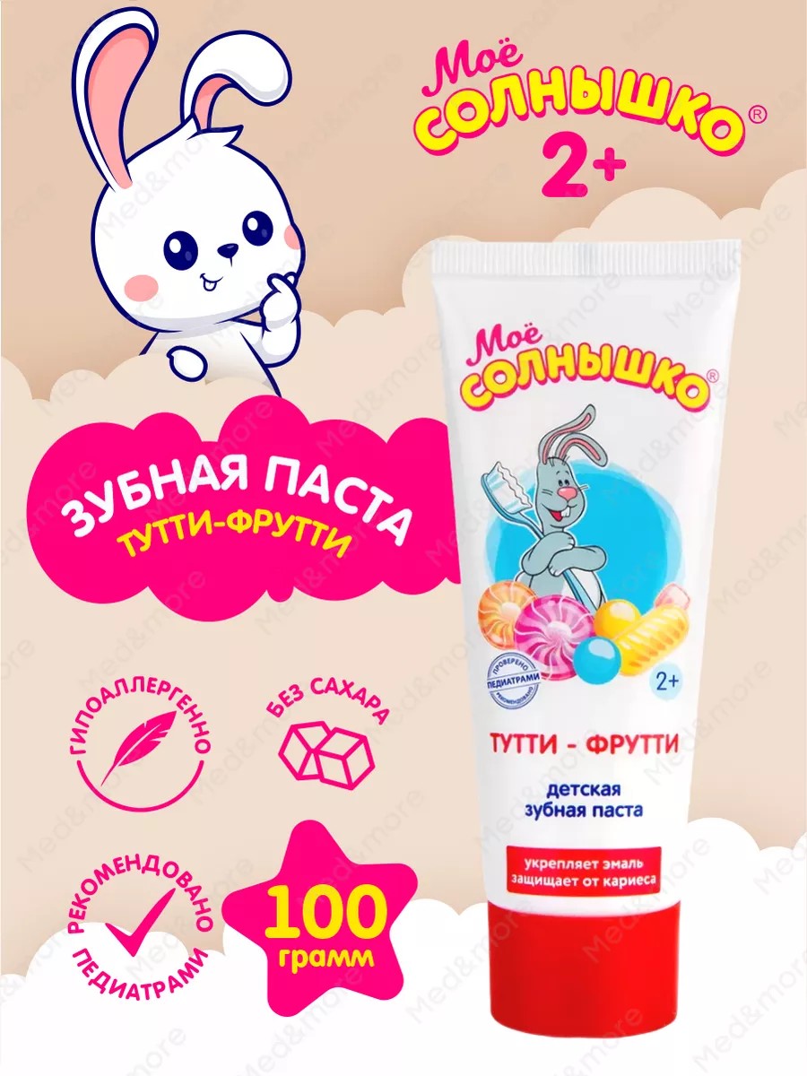 Tutti-Frutti My Sunshine Children's Toothpaste, 100g. Gentle cleaning of baby and permanent teeth. Calcium and fluoride help strengthen tooth enamel and provide protection against cavities. The pleasant aroma and taste of Tutti-Frutti will help your child develop the habit of daily brushing. Suitable for children 2 years and older. Protects against cavities. Safe if accidentally swallowed. Sugar-free. Contains sodium monofluorophosphate. Fluoride content: 0.04%.