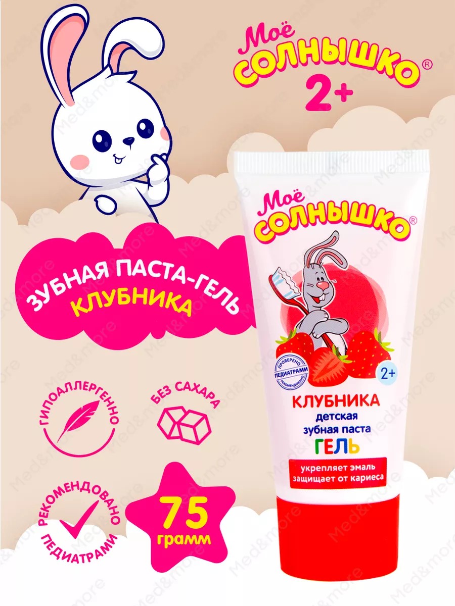 Зубная паста-гель детская клубника Моё Солнышко 75 гр. Бережное очищение молочных и постоянных зубов ребенка. Кальций и фтор способствуют укреплению зубной эмали и обеспечивают защиту от кариеса. Приятный аромат и клубничный вкус помогут ребенку сформировать привычку ежедневно чистить зубы. Подходит для детей с 2 лет. Безопасно при случайном проглатывании. Без сахара. Гипоаллергенно. Формула создана для сведения к минимуму риска возникновения аллергической реакции в случае индивидуальной непереносимости ингредиентов состава. Способ применения: Количество пасты величиной с горошину выдавить на зубную щетку, чистить зубы 2-3 минуты 2 раза в день под присмотром взрослых. Возможна индивидуальная непереносимость ингредиентов состава. Содержит монофторфосфат натрия. Массовая доля фторида 0,03%.