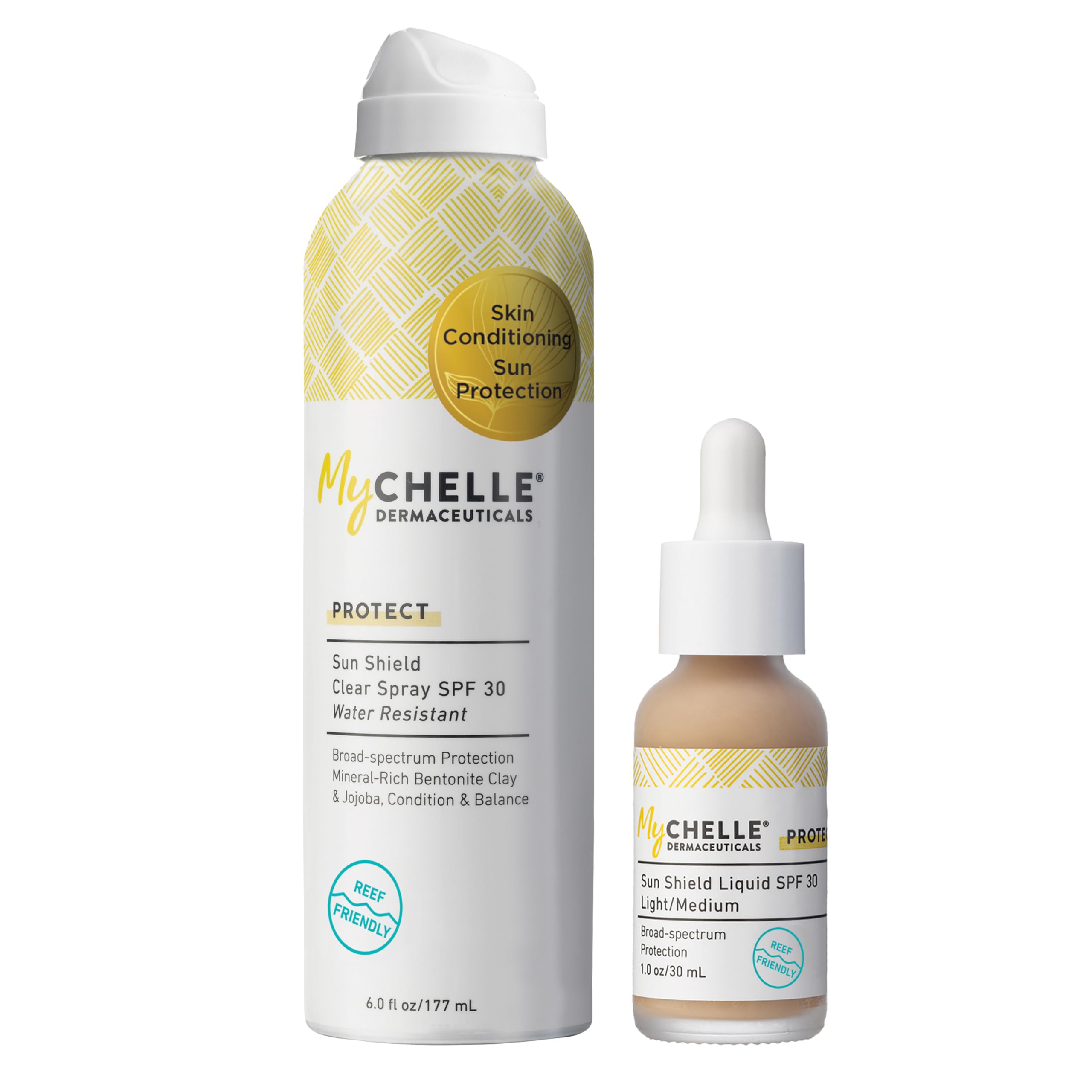 MYCHELLE PROTECT: Our sun care collection is designed to protect your skin against premature aging symptoms through a broad-spectrum formula This reef safe zinc sunscreen keeps you sun-safe year round. USE DAILY: Apply sunscreen liberally and evenly 15 minutes before sun exposure Reapply sunscreen after 80 minutes of swimming or sweating, immediately after towel drying, or at least every 2 hours. CLEAN INGREDIENTS: Does not contain retinyl palmitate or chemical UV absorbers including octinoxate, octisalate, oxybenzone, or PABA Made without parabens, petroleum, phthalates, silicones, sulfates, ureas, artificial fragrances, and artificial colors. MYCHELLE SUNSCREEN: SPF Broad-spectrum formula to keep out UVA and UVB rays This MyCHELLE sunscreen formula offers water-resistance for various activities. 2 PACK: Bundle of Sun Shield SPF 30 Spray, and Sun Shield 30 Liquid in Light Medium shade.